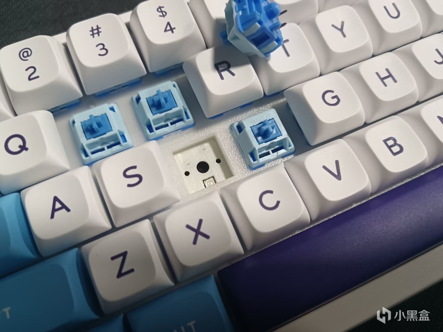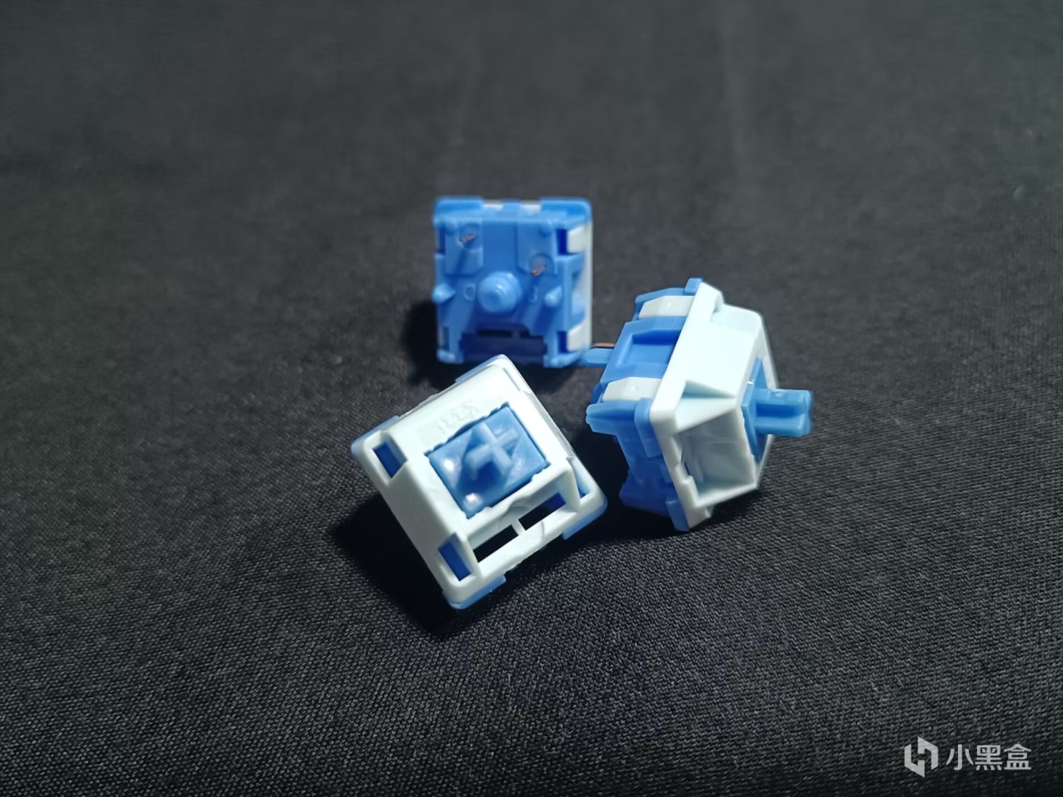 相聚轴,九紫代工,线性五脚轴,蓝色的轴心和底壳,浅蓝色上盖,LY加长轴心,外壳是pom材质,触发行程1.2mm,总行程3.4mm,触发压力42g,触发快,回弹迅速,适合打游戏。