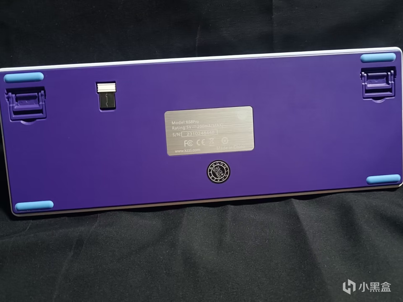 键盘整体配色和键帽配色主题呼应,紫色的背板配上蓝色的硅胶防滑垫,显得极其和谐,背板上面开出来了一个2.4g接收器磁吸收纳仓,磁力适中,够用但不紧,背板上面的铭牌采用的是金属铭牌,表面进行了拉丝处理,上面使用激光雕刻标注出了这款产品的基本信息。