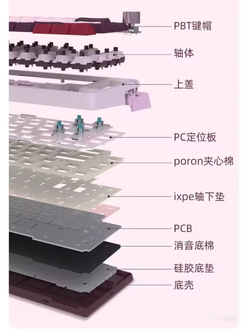 填充方面采用的是poron夹心棉+ixpe轴下垫+pet声优垫+底部消音棉+开模硅胶底垫五层填充消音,相较于K68经典版,K68Pro多了一层pet材质的声优垫。