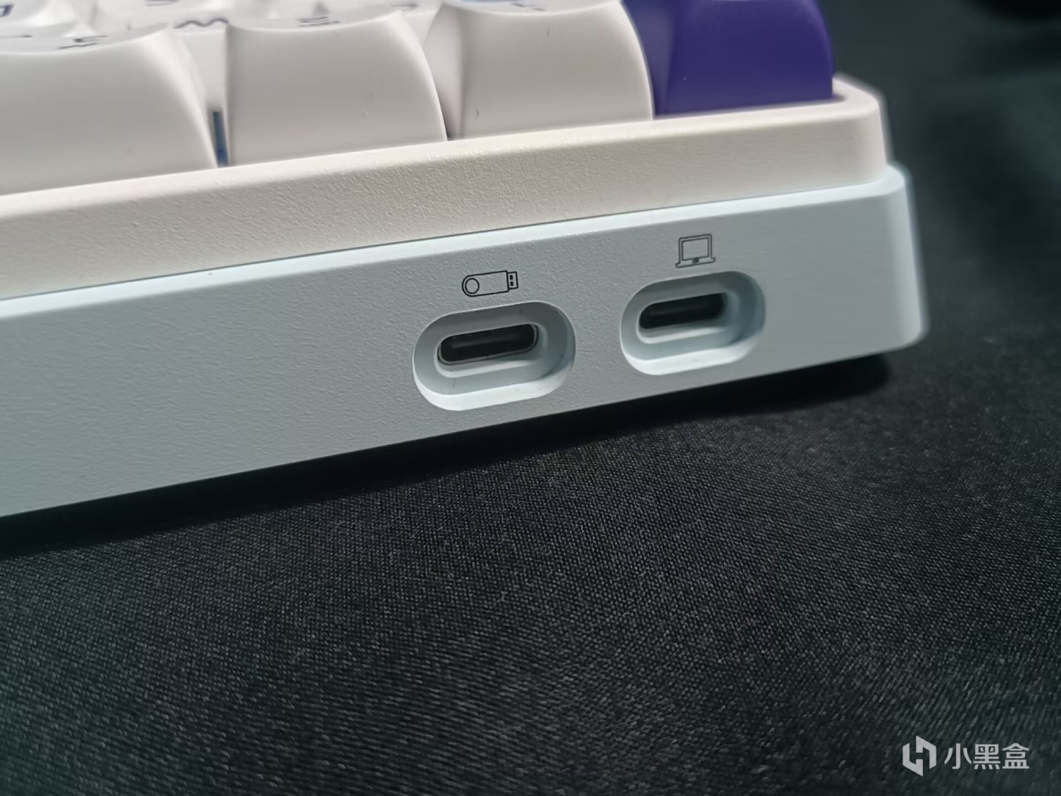 这款键盘上面有两个C口,一个C口上方标注了电脑的图标,很明显是和电脑连接的,另一个接口上面是U盘的标识,这个接口支持数据读取,也可以连接其他外设,这个在电脑主机USB接口不够用的时候就很方便了,不过这些都是在有线模式下实现的。