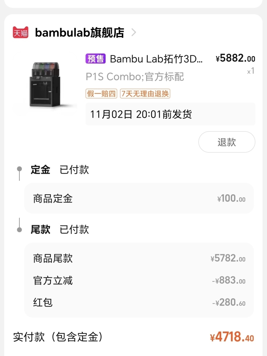 双十一某宝88会员卷可以叠加到4700拿下p1s加ams系统,还是非常划算的。平时这个套装价格在5500元。