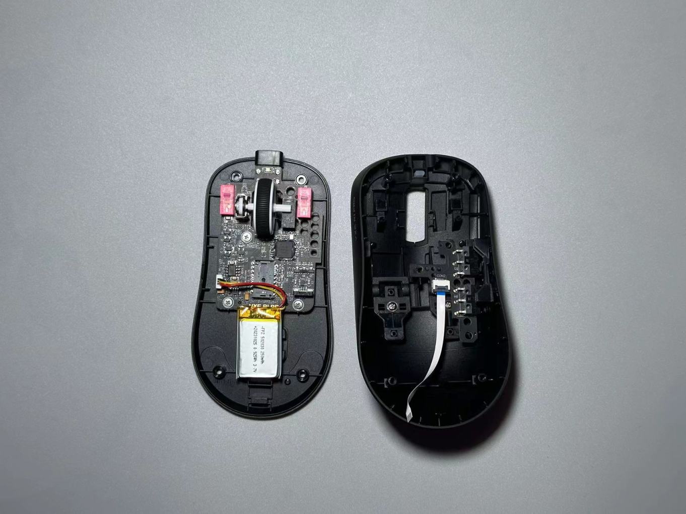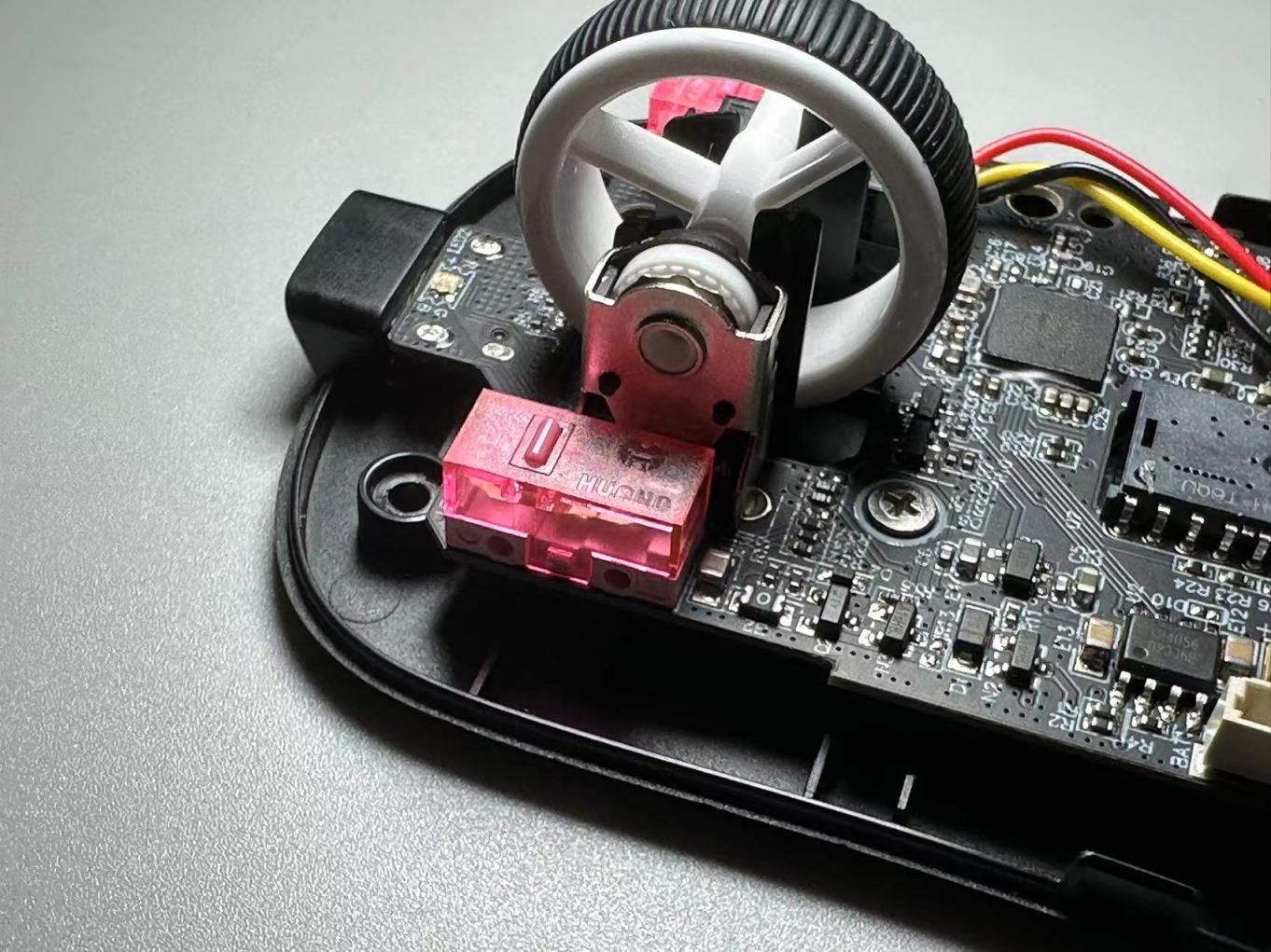 R1PRO的滚轮做了镂空减重处理。左右按键就采用的是环诺冰梅粉点,编码器则是TTC银轮,中键则是华诺的红点。