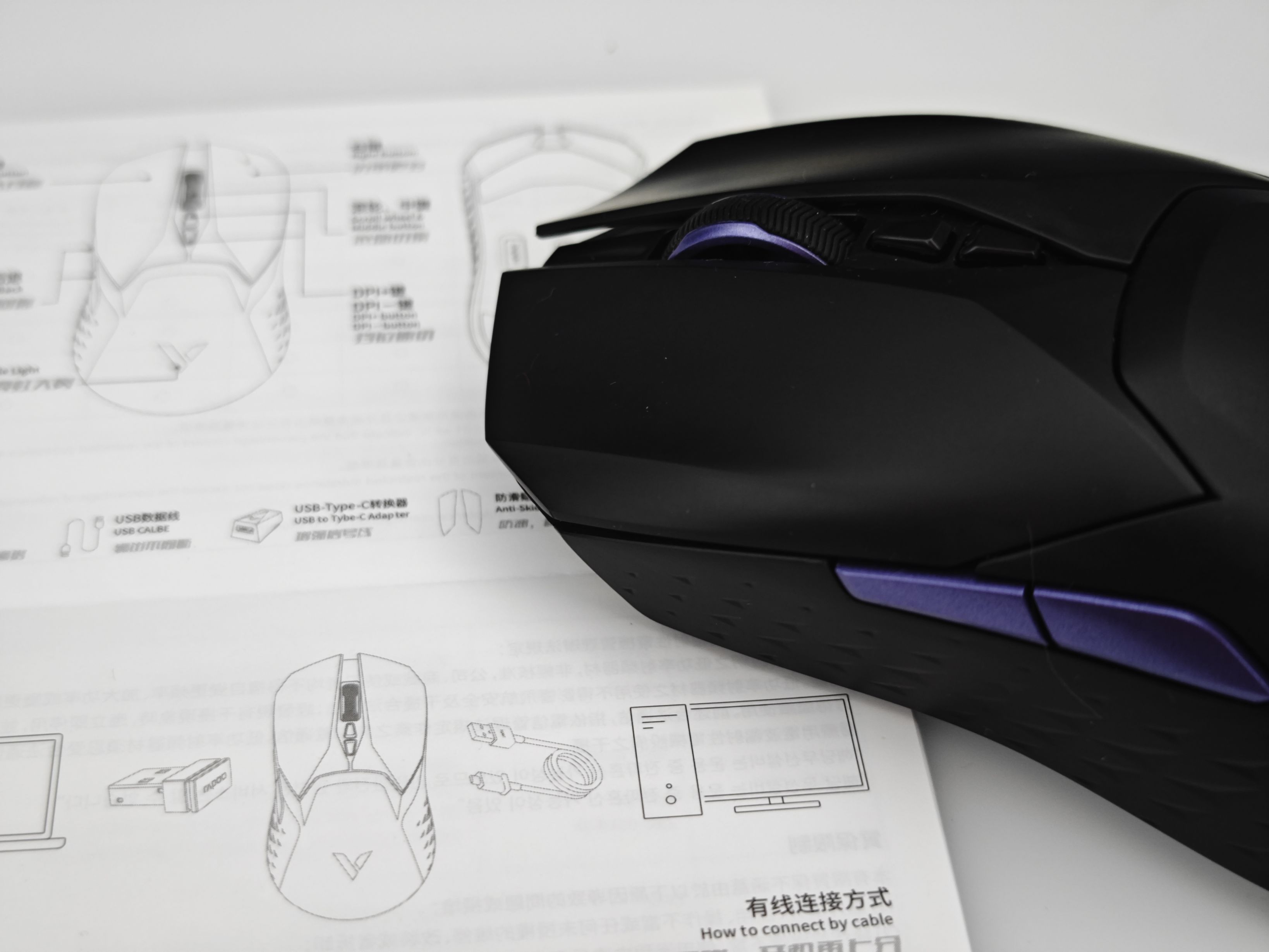 VT3S给小航母的初印象还是很不错的,黑紫配色看上去相当高级。鼠标整体看上去很纤细,有一只锋刃的棱角感。128.3x66.2x38.5mm尺寸,适合中大手。鼠标整体模具采用人体工学设计,抓握,指哦,趴握都非常合适。左右按键末端三角元素设计给我一种“蝙蝠侠”的感觉,侧裙上有棱形纹缕设计。方便排汗的同时,能够增强抓握,指握玩家的手感。