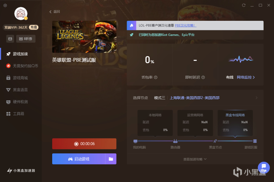 ②貼出在小黑盒加速器中加速《英雄聯盟-pbe測試服》的截圖(如下圖)