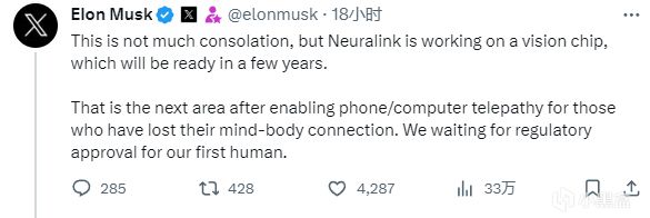 2023年11月8日,馬斯克再次公開了新技術,旗下的Neuralink公司正在開發一款腦機專用芯片,可以幫助失明人羣重新獲得“視覺”,並且預計會在近幾年內發佈!