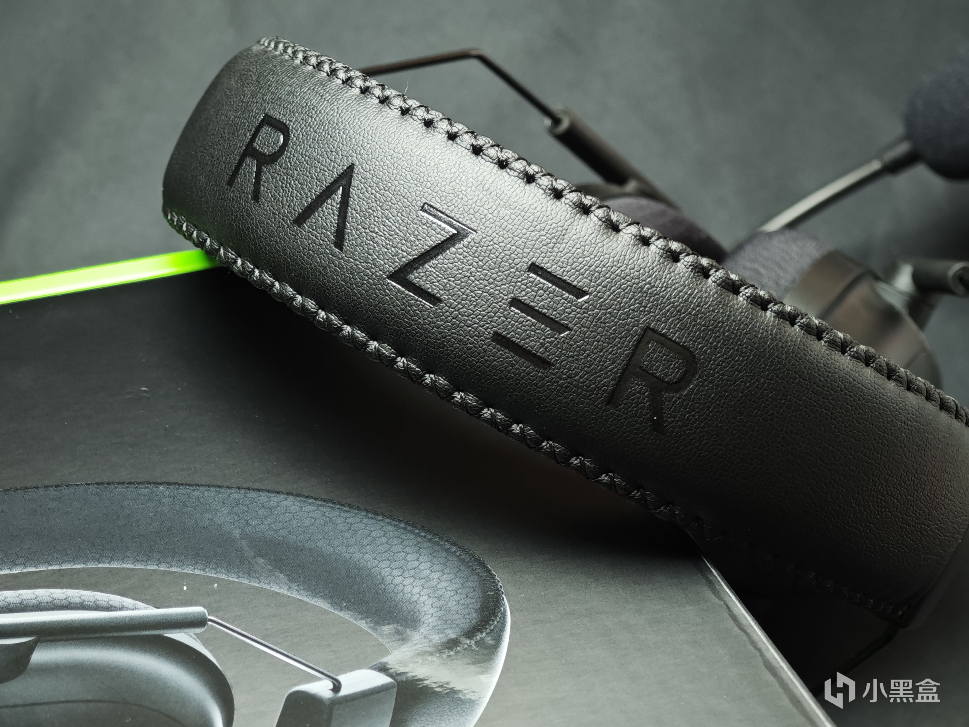 头带部分,上方采用的是这种类似皮革的材质,中间的位置有雷蛇的名字,整体相较于我之前所使用的北海巨妖提高了不止一个档次,选用这种材质也会更加的耐用,不像我之前的耳机用一年就断掉返修了。两边是用了锁边来防止开裂以及掉皮,整体看起来还是很精细的。
