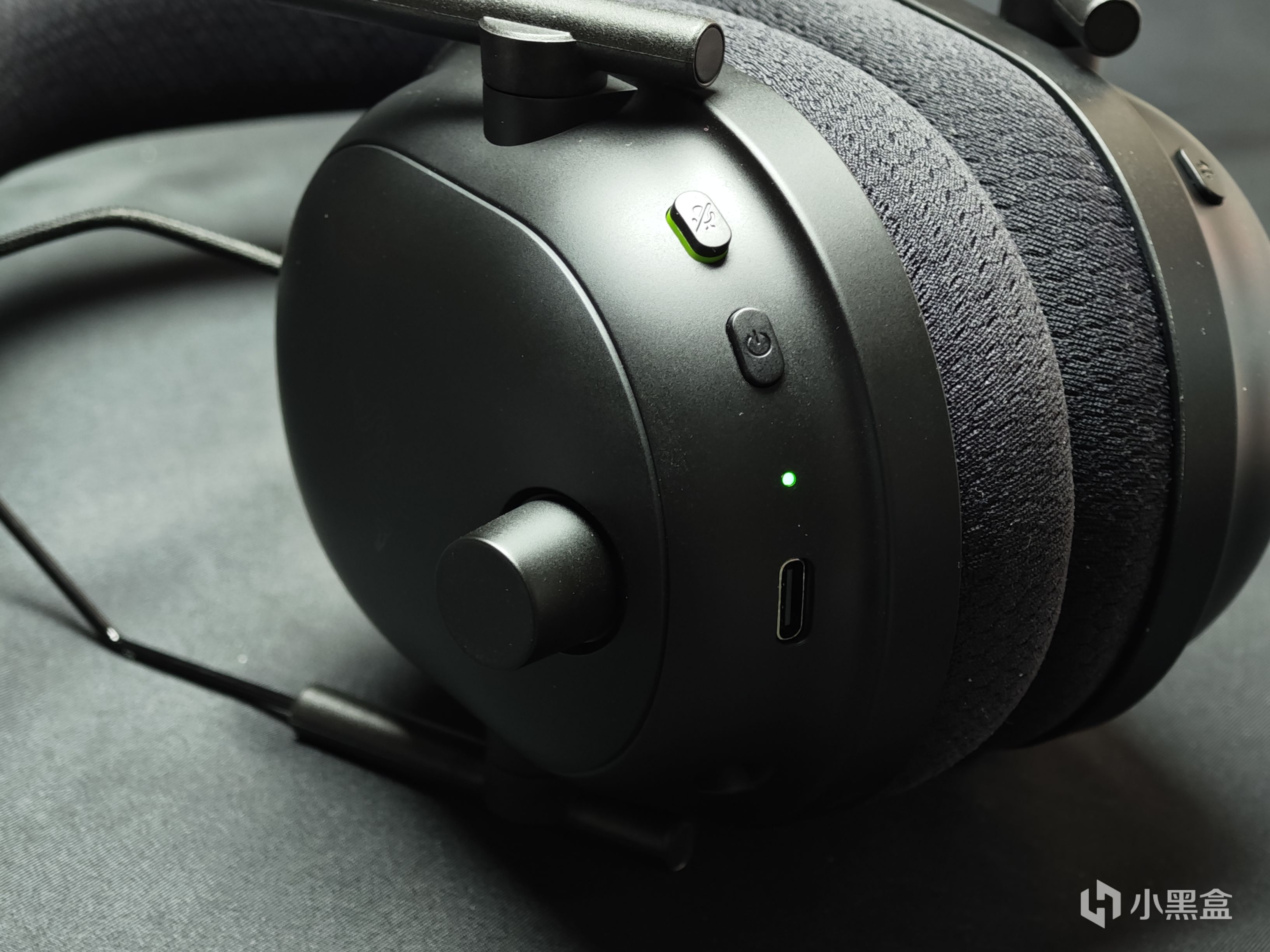 耳机的绝大多数实体按键都在左侧耳罩上,包括麦克风、开机键、指示灯以及充电接口,在麦克风按键上,能看到久违的绿色,雷蛇啊雷蛇,没想到你还是藏了一抹绿色在这里。同时可以看到,旋风黑鲨V2专业版的接口为Type-C,而非前代的Micro接口,可以说拿一根C口的线,就足以给所有外设设备充电(要是用的是GPW当我没说)。