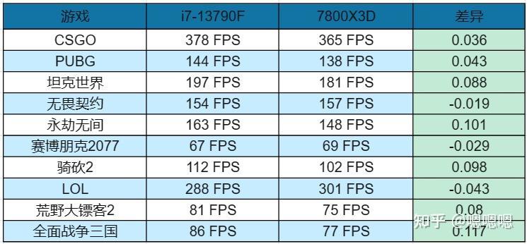 - i7-13790F和7800X3D在遊戲性能方面的差距並不大,兩者都能夠提供流暢的遊戲體驗,但是i7-13790F在大部分遊戲中都有輕微的優勢,平均領先幅度爲4.5%,這說明i7-13790F的高頻率設計,比7800X3D的大緩存設計,更加適合處理各種遊戲場景。