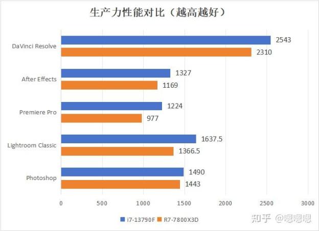- i7-13790F在理論性能和生產力性能方面都大幅領先於7800X3D,平均領先幅度高達20%以上,這說明i7-13790F的Raptor Cove架構和高頻率設計,比7800X3D的Zen 3架構和大緩存設計,更加適合處理各種複雜的計算任務。