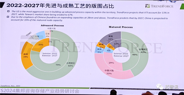 集邦咨询预测,随着台积电美国晶圆厂的量产,以及英特尔在美国晶圆代工产能的扩大,预计到2027年,美国在全球先进制程产能当中的占比将猛增至12%;