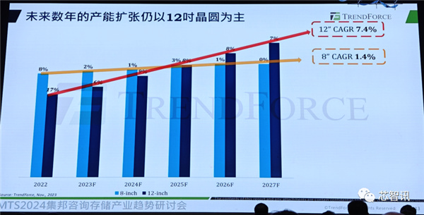 从未来晶圆产能的增长来看,到2027年,12英寸晶圆的年复合增长率将达7.4%,8英寸晶圆产能的年复合增长率将只有1.4%。