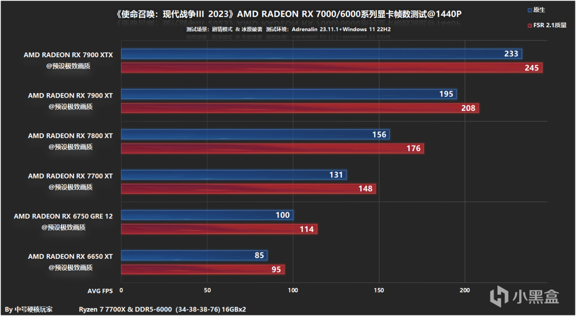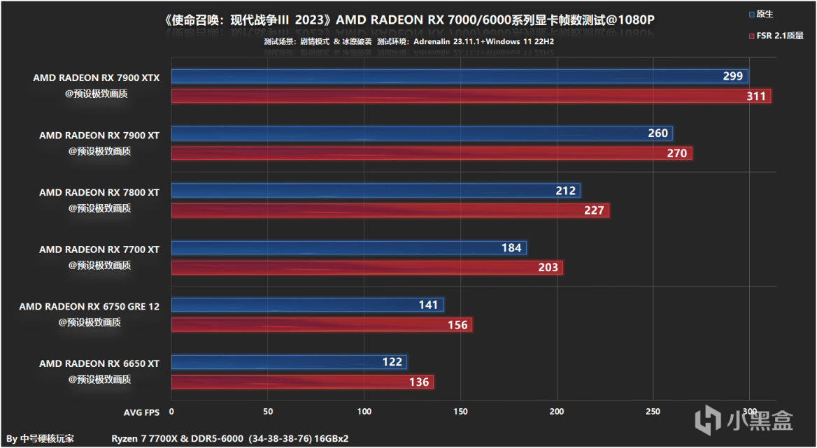 1080P分辨率,对于剧情党来说,只需要RX 6650 XT就能满足上百帧的帧数需求,FSR 2.1提升幅度在这些显卡之中也是RX 6650 XT最大。而个人建议有条件最好上RX 6750 GRE 12,搭配入门高刷屏更为稳妥,进阶一点RX 7700 XT也足够满足了,毕竟平均帧数可是能达到200fps。