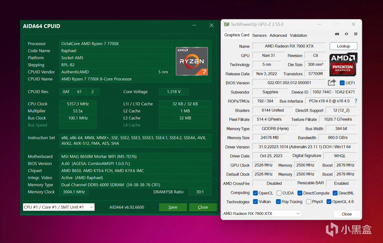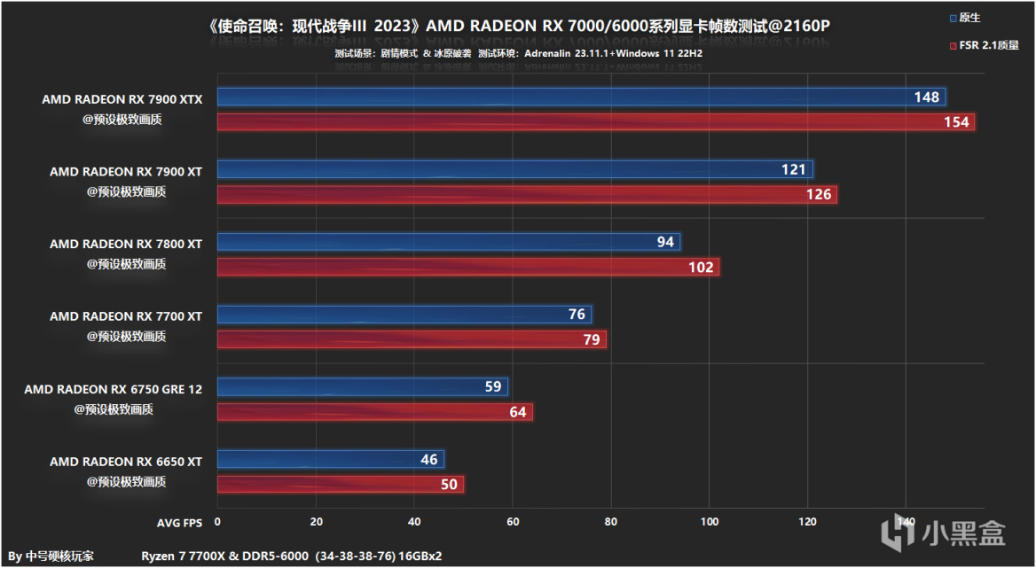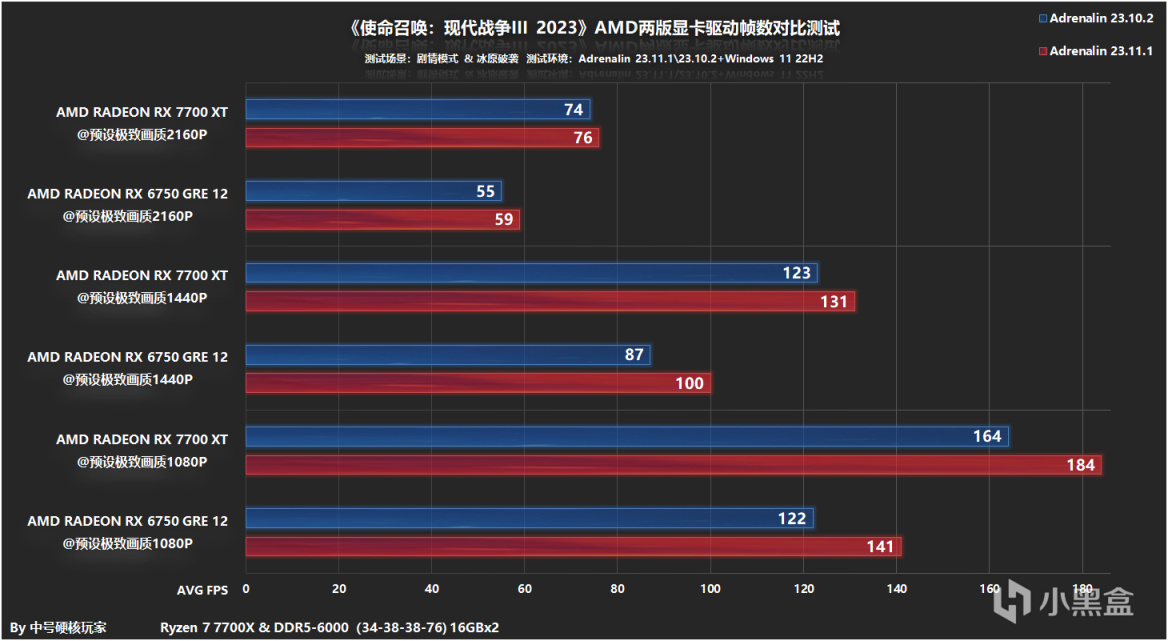 本次测试安装的是AMD Adrenalin 23.10.2和23.11.1(最新)两个版本的显卡驱动,后者有针对游戏进行优化前者则没有,后面的测试环节将会看看两个版本之间的帧数差异,操作系统是Windows 11 22H2最新版本,设置处理器锐龙7 7700X开启PBO技术,搭配两根DDR5 6000C34 16GBX2组成双通道内存,并在BIOS中开启Resizable BAR技术提升一些显卡性能。