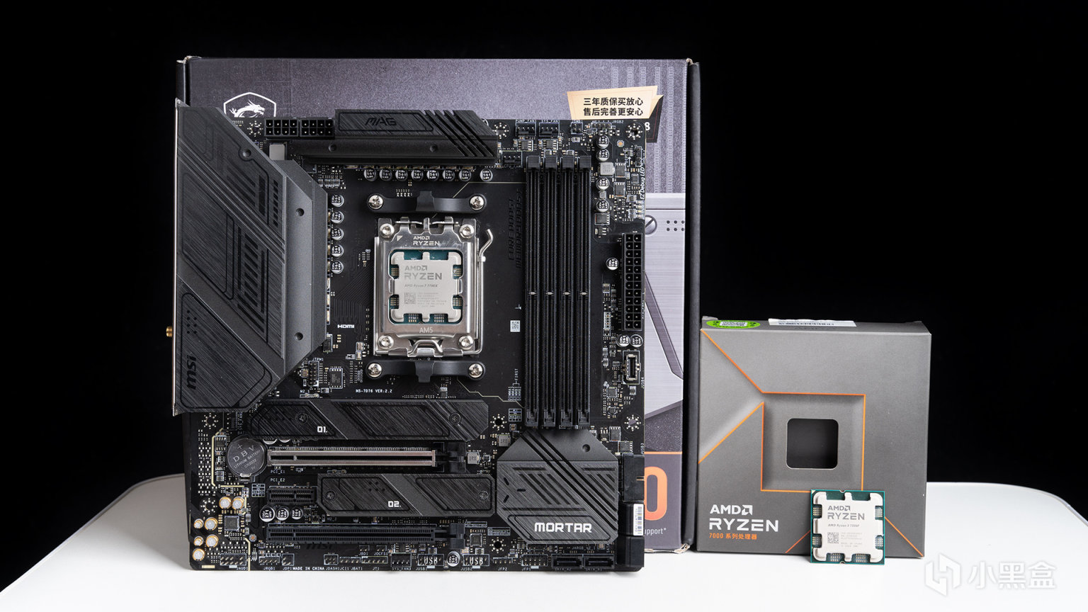 本次A卡测试当然还是在3A平台下测试,处理器是锐龙7 7700X,搭配的主板是来自微星MAG B650M MORTAR WIFI迫击炮,它整体采用了大面积黑色+灰色元素混搭,本身就不带ARGB灯光风格低调,主板供电规模达到12+2相,其中CPU VCore部分最大电流支持到80A,可以完美带动锐龙7000家族全系成员。