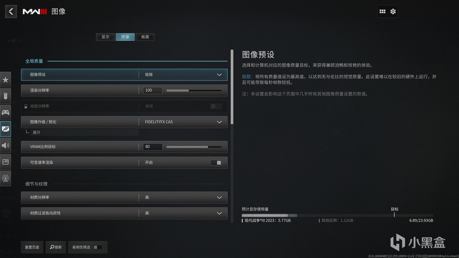 来到画面设置选项,印象中是从16代就一直是这种风格的UI设计,其采用的IW引擎和去年相比应该也没有太大的变化,可调节的子选项超过20多个,画质预设拥有最小、基础、平衡、终极和极致五种方案可选,能够覆盖更多不同硬件阶层的玩家,这一代也是没有光线追踪加持,硬核还记得只在16、17这两代有加持光追,对于COD来说能去除光追其实也是正确的选择。