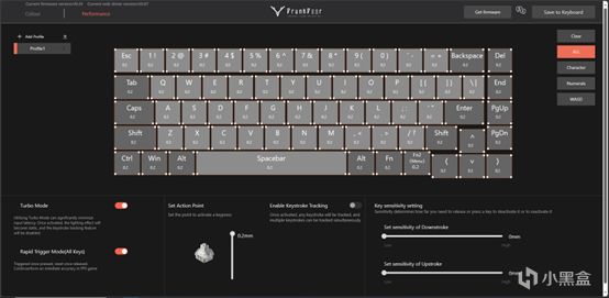 比较有趣的是,相较于A75的驱动,G65只有网页驱动,分别可以控制灯光模式和各个键轴体的设置情况,你可以在网页驱动中对每一个按键的轴体行程和灵敏度进行更改,只将需要的键改为一触即发,就会大大减少误触的风险,当然如果你和我一样喜欢偷懒的话,也可以选择旁边的all,然后直接全部更改,实际体验下来,在适应之后,误触的情况并不会太常见,并不会影响到游戏体验,不过建议一开始先从0.6尝试,之后再慢慢拉到0.2。