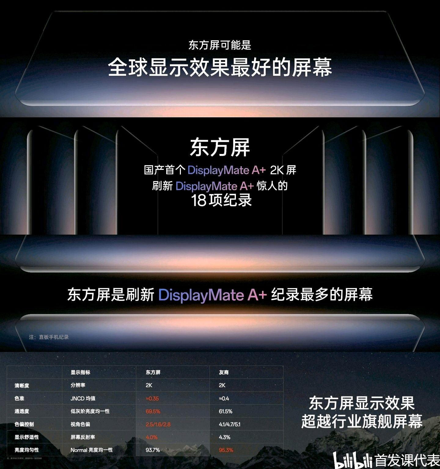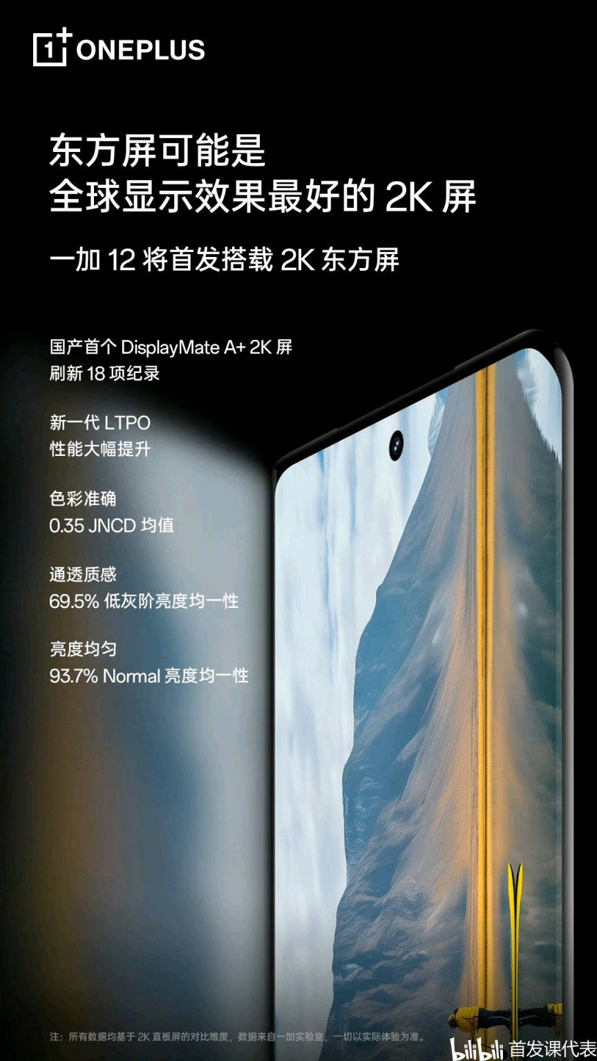一加介绍称,“东方屏”搭载 OPPO 第一代显示芯片 Display P1 + 高精像素级校准算法,带来更优画质、更高亮度、更低功耗。一加 12 已经获得了 DisplayMate A+ 的认证,“东方屏”不仅是国产首个 DisplayMate A+ 的 2K 屏,还刷新了 DisplayMate A+ 的 18 项纪录。