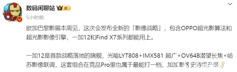 11 月 9 日消息,今日,一加官宣,一加 12 手机将是一加首款完整搭载「新一代超光影影像系统」的旗舰产品,搭载联合索尼研发的光喻 LYT-808 传感器,号称“主摄实力可能是同档最强”。