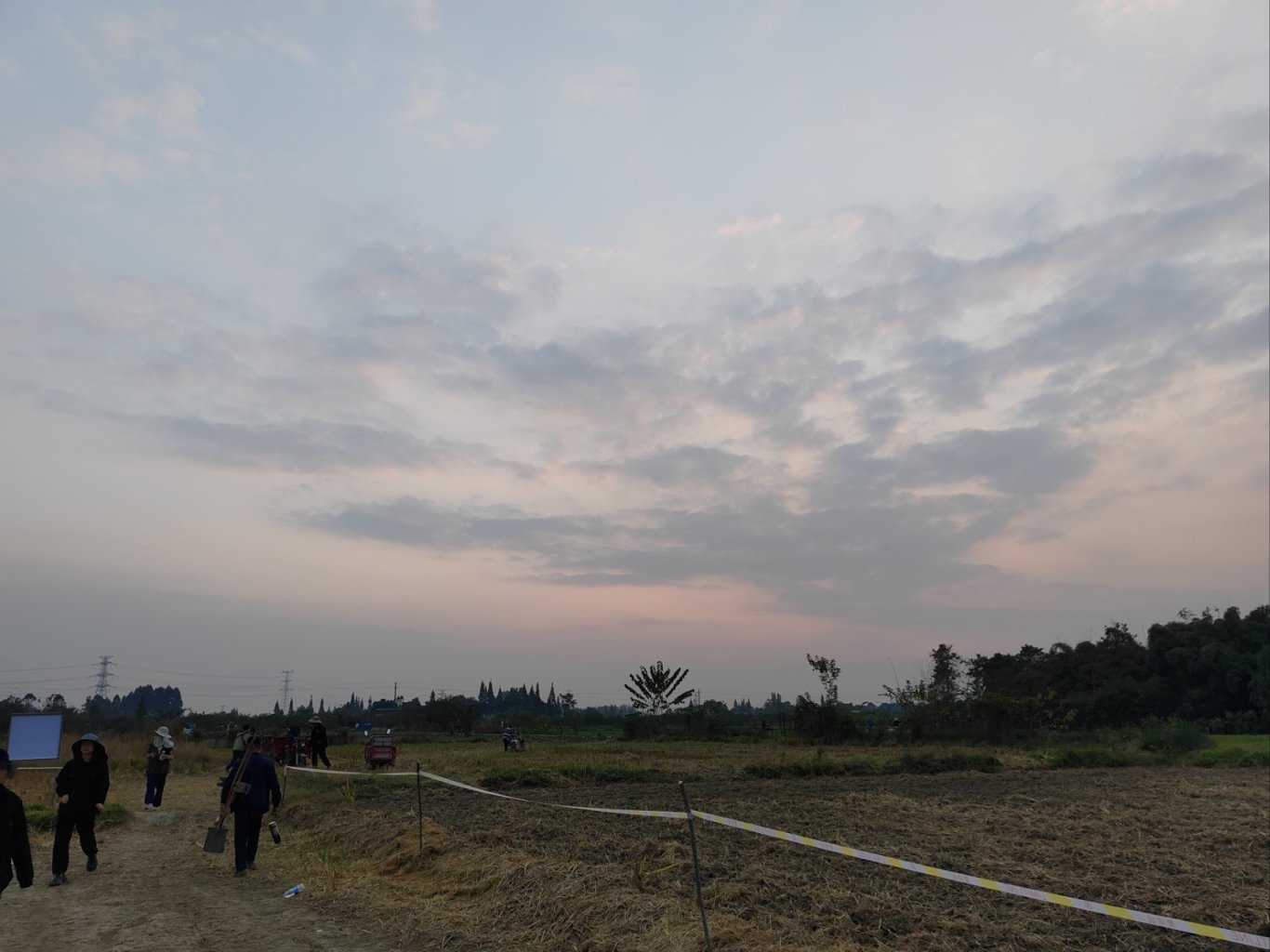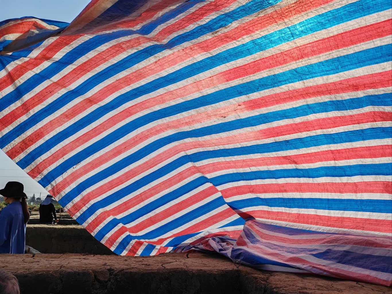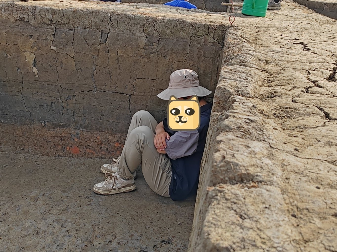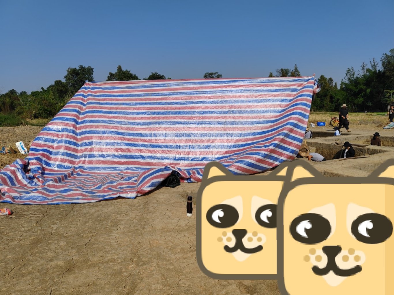 這事很有意思,那一天太熱太熱了我們又準備乾重要活,怕土被曬太乾了,叔叔阿姨就拿了這個大篷和幾根竹子擋太陽,結果非常非常抽象,這個布特別大,賊顯眼,而且裏面真的涼快多了,後面有些探方的叔叔阿姨也發現了就也帶了,結果就被老師喝回去讓他們收了(最後就是繼續曬太陽ing)