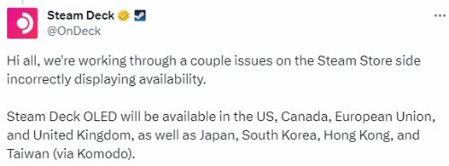 V社正式宣布将推出Steam Deck掌机的升级版本OLED机型后,官方推特发文表示:消息公布初期Steam商店端存在错误显示的问题,后续发文确认Steam Deck OLED将在中国香港、中国台湾、美国、加拿大、欧盟、英国、日本、韩国推出。官方给出的上市时间为太平洋时间11月16日(北京时间11月17日)。