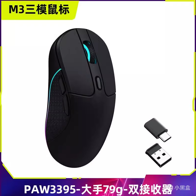 PAW3395+凱華GM8.0微動+3模+RGB,79g的重量,整體紙面數據拉滿。它還有兩個2.4G適配器,不管你電腦是A口和C口,他都能完美適配。