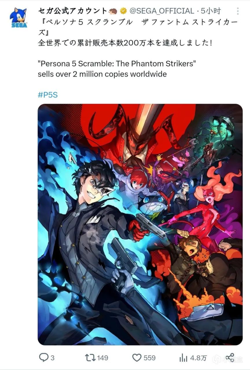 2、今日,世嘉官方宣佈《女神異聞錄5 亂戰:魅影攻手》全球銷量現已突破200萬份。該遊戲最早於2020年2月20日登陸PS4和NS,後續於2021年2月23日發佈PC版,但至今仍未推出Xbox版。