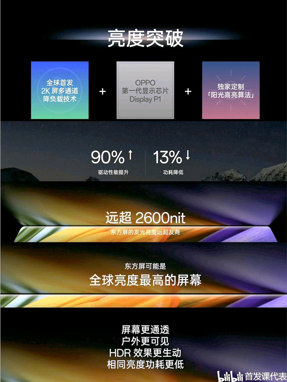 一加表示,“東方屏”首發多通道降負載技術,並在 Display P1 上加入陽光高亮算法,屏幕驅動性能提升 90%,功耗降低 13%,東方屏最大亮度已遠超行業 2K 屏最高的 2600nit。