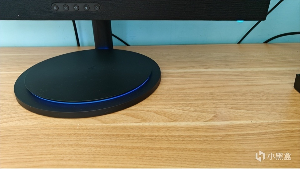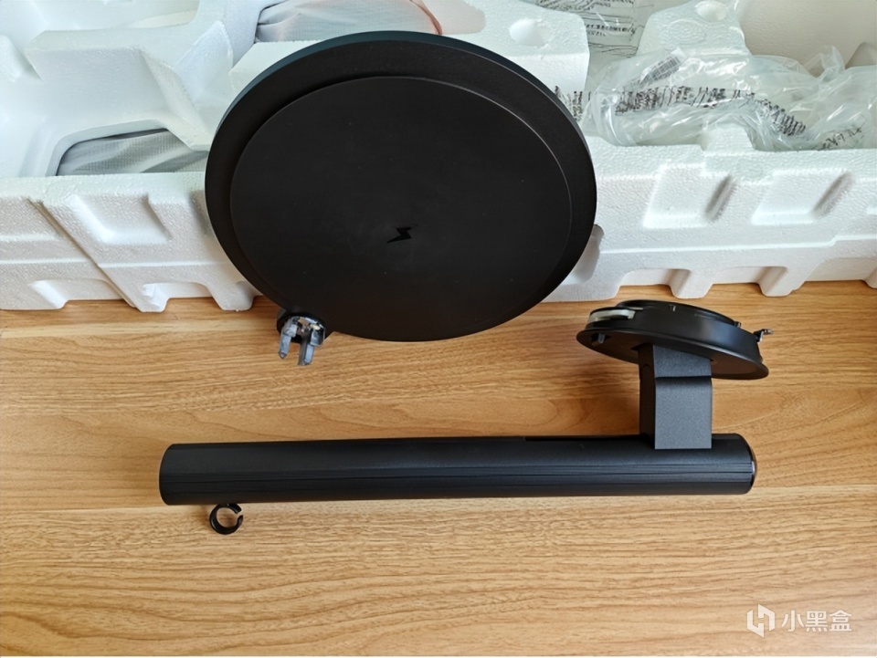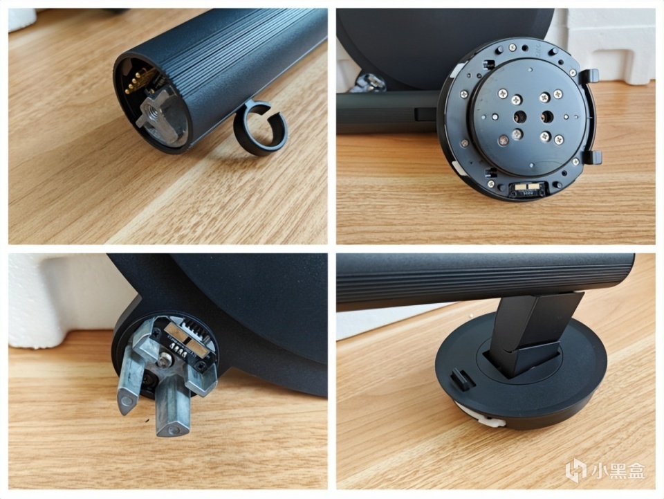 我們看立柱和底座採用免工具連接方式,並且之間還有電氣連接。前面我們提到過,這款顯示器的底座是支持無線充電的。