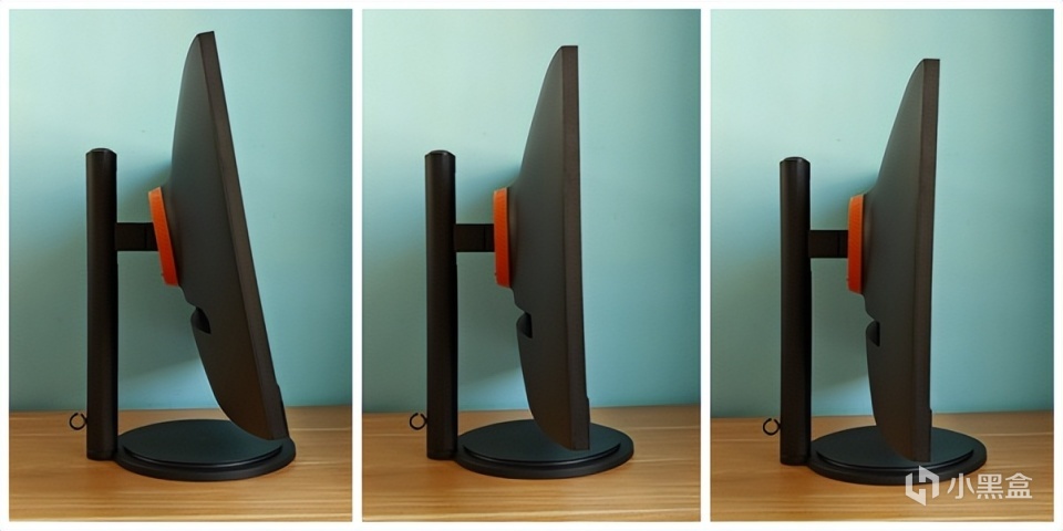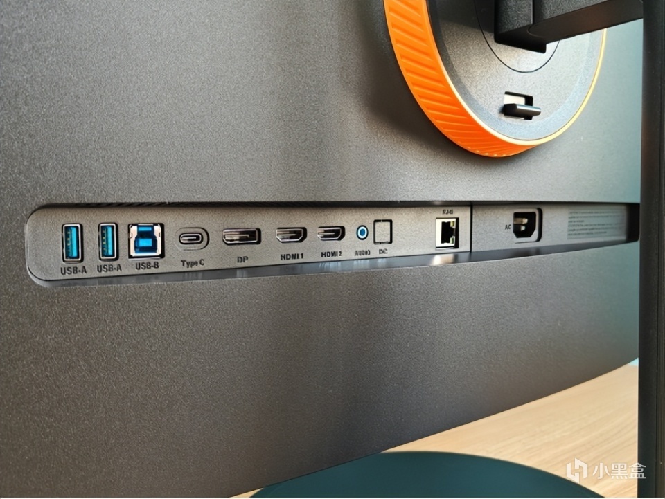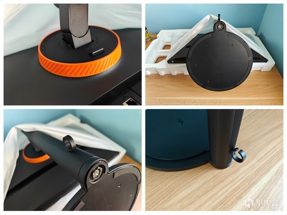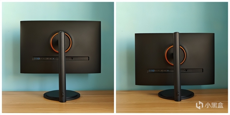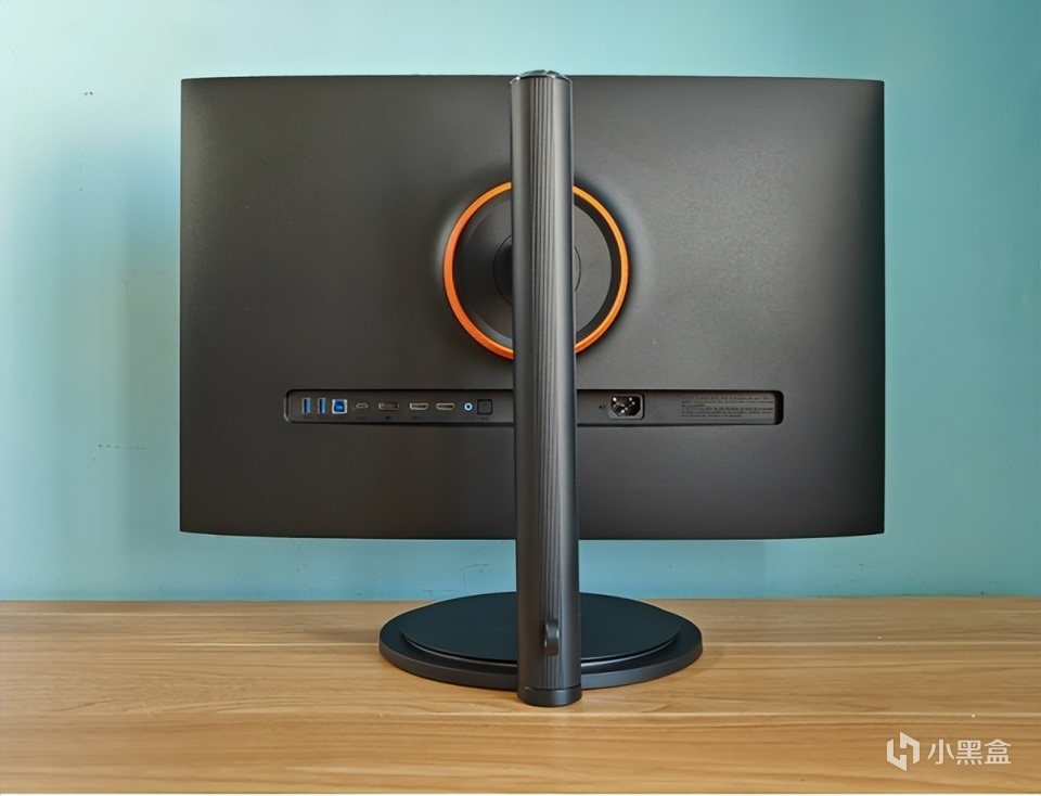 顯示器裝好的樣子,背部有個圓形的橙色環,非常醒目,畫龍點睛,顯得非常好看。圓形元素較多,底座是圓形的,背部的圓環,還有圓形的立柱。