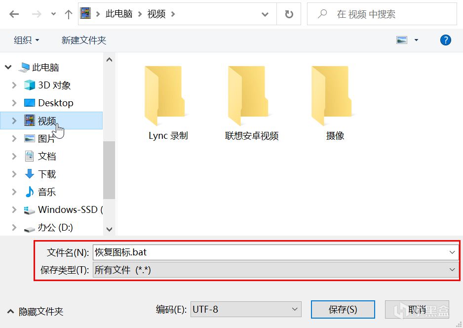 2、点击“另存为”,文件名改为“恢复图标.bat”,保存类型选择“所有文件”,点击“保存”即可