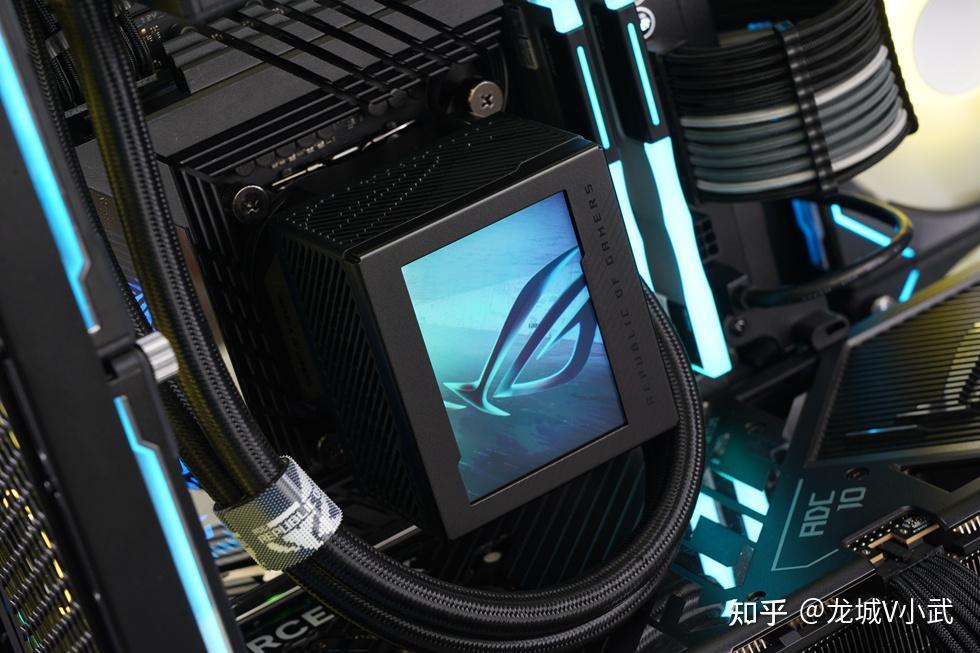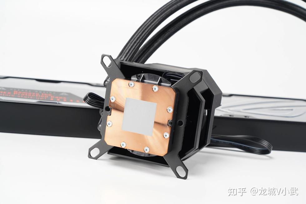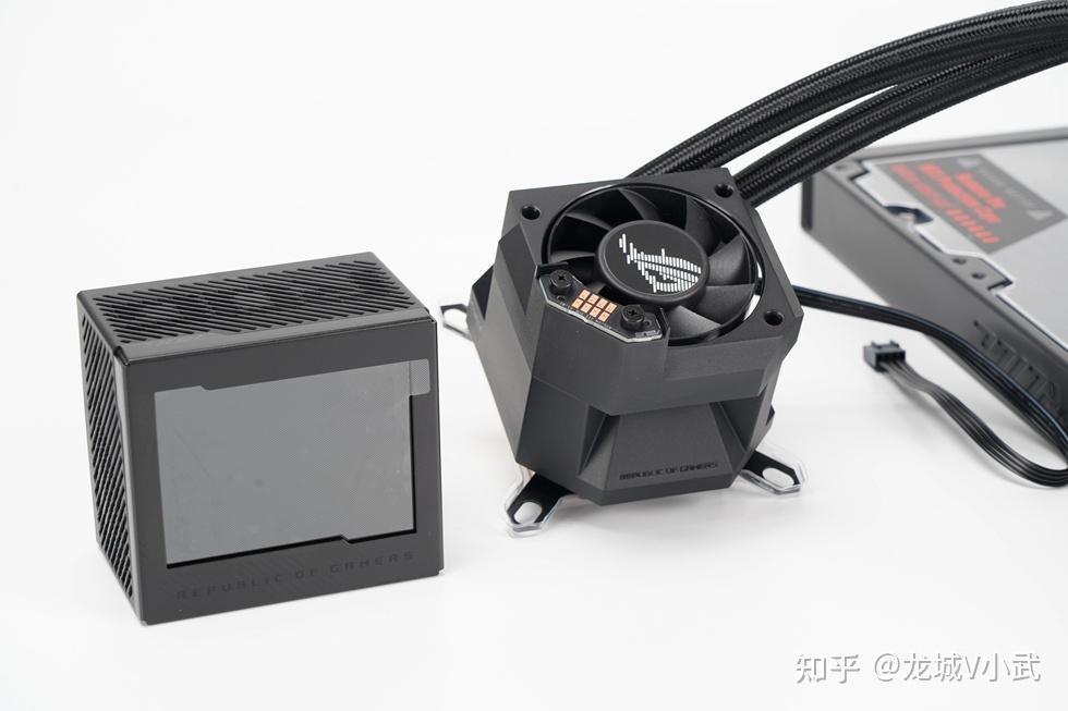 散熱器的冷頭很有特色,其冷頭頂部配備了一塊3.5寸的LCD屏幕,分辨率爲320*240,冷頭的頂蓋可以拆下,頂蓋通過磁吸的方式固定在冷頭上,經過觸點與冷頭對接進行供電。內部集成了一枚6cm的小風扇來給主板的供電元件進行輔助散熱,風扇最大轉速4800rpm,水泵採用Asetek第8代水冷方案,散熱效能提升非常明顯,這也是目前多數旗艦水冷上常見的方案。