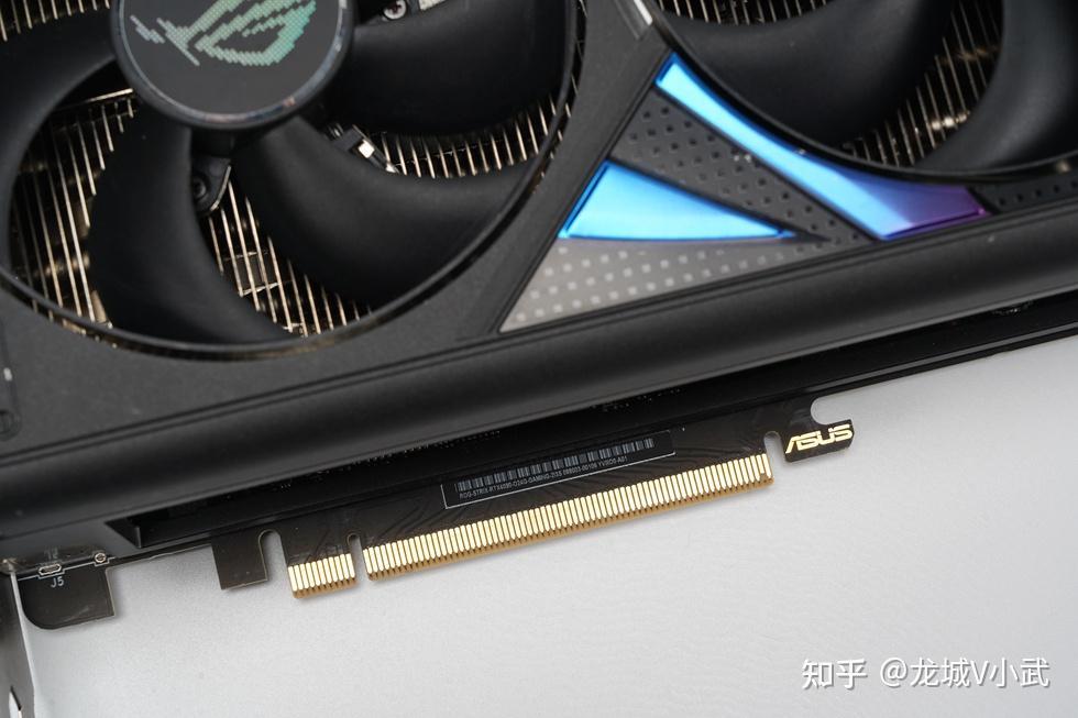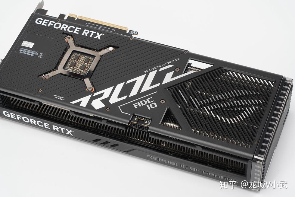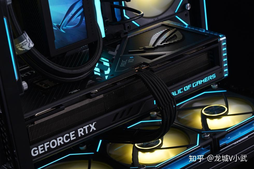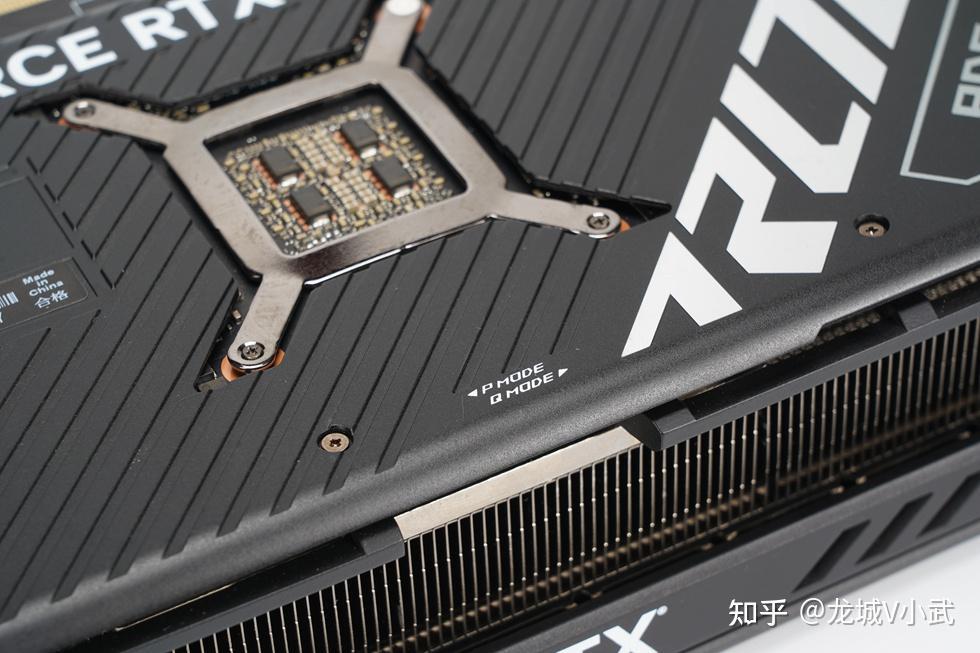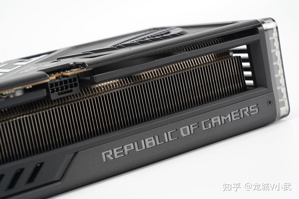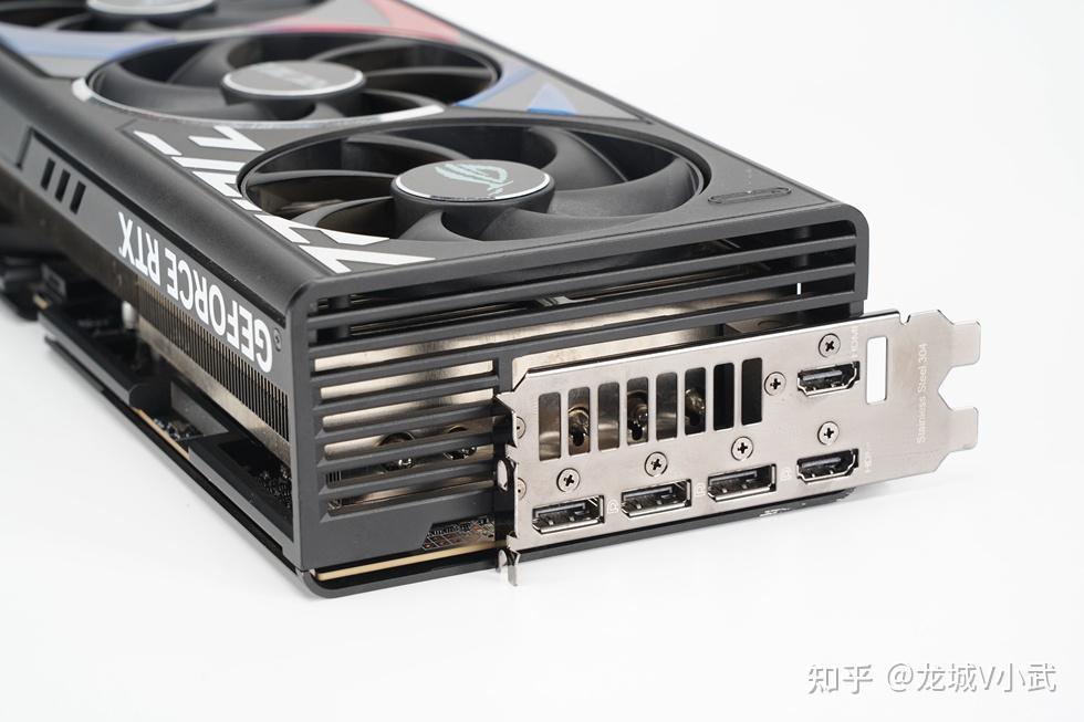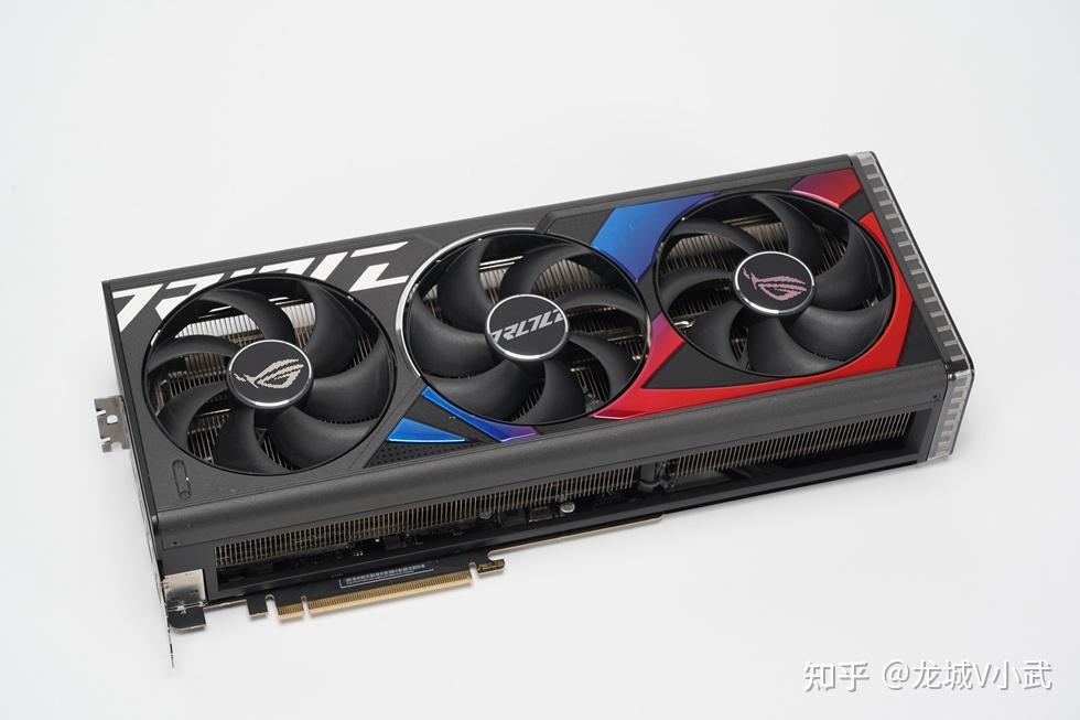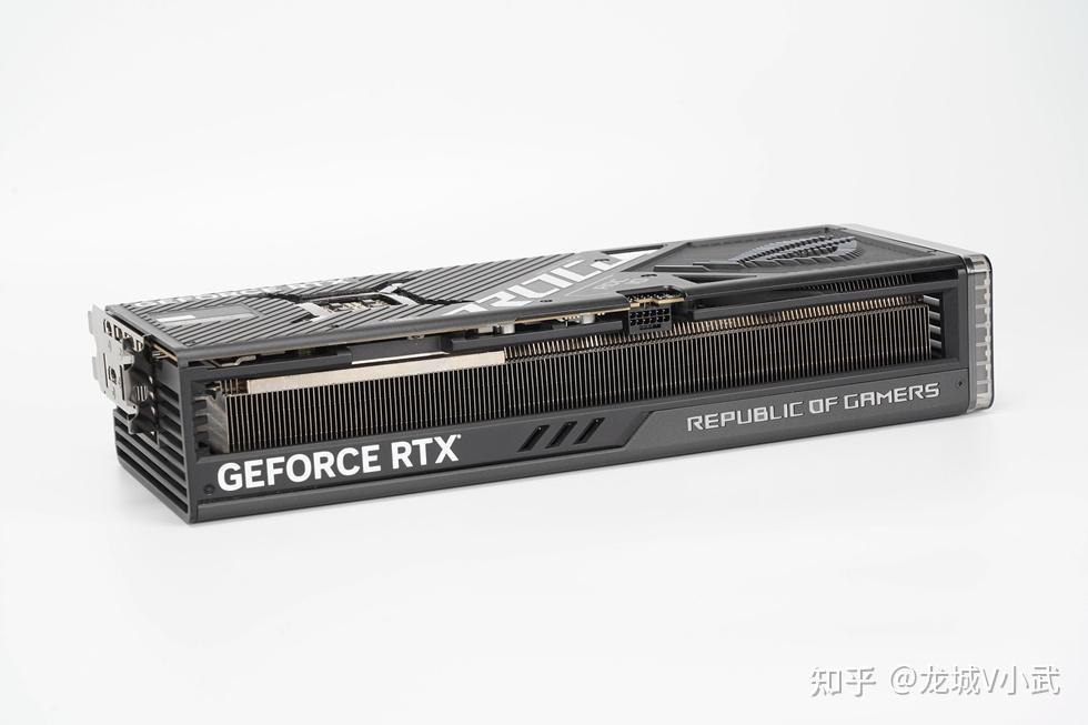 顯卡使用的是華碩 ROG STRIX GeForce RTX 4090 O24G GAMING,碩大的顯卡本體,三圍尺寸更是達到了 360mm×70mm×135mm,顯卡採用了全包圍式散熱面板和背板,材質爲ADC10高硬度鋁合金材料,這也使得顯卡重量達到了2.5公斤之多。其搭載了AD102-300-A1 GPU核心,集成了16384個CUDA核心、默認頻率2610MHz, Boost頻率2640MHz,顯存爲24GB GDDR6X,位寬384Bit。