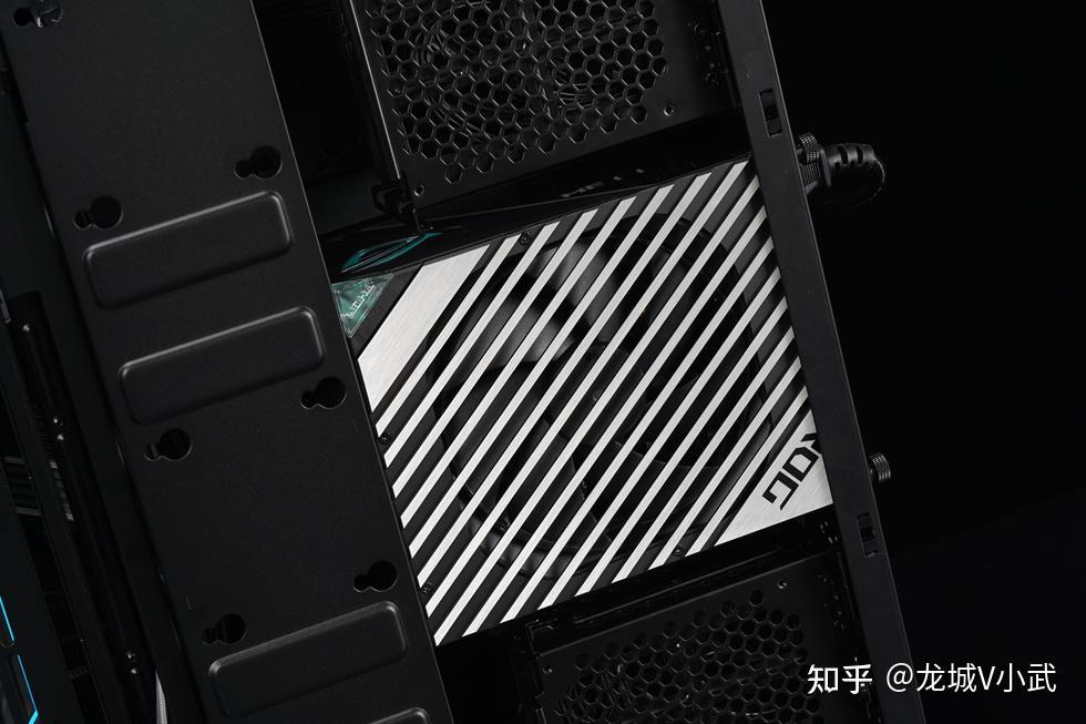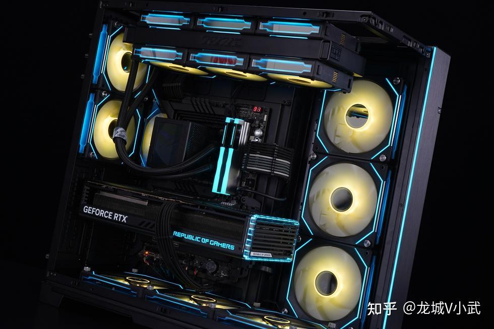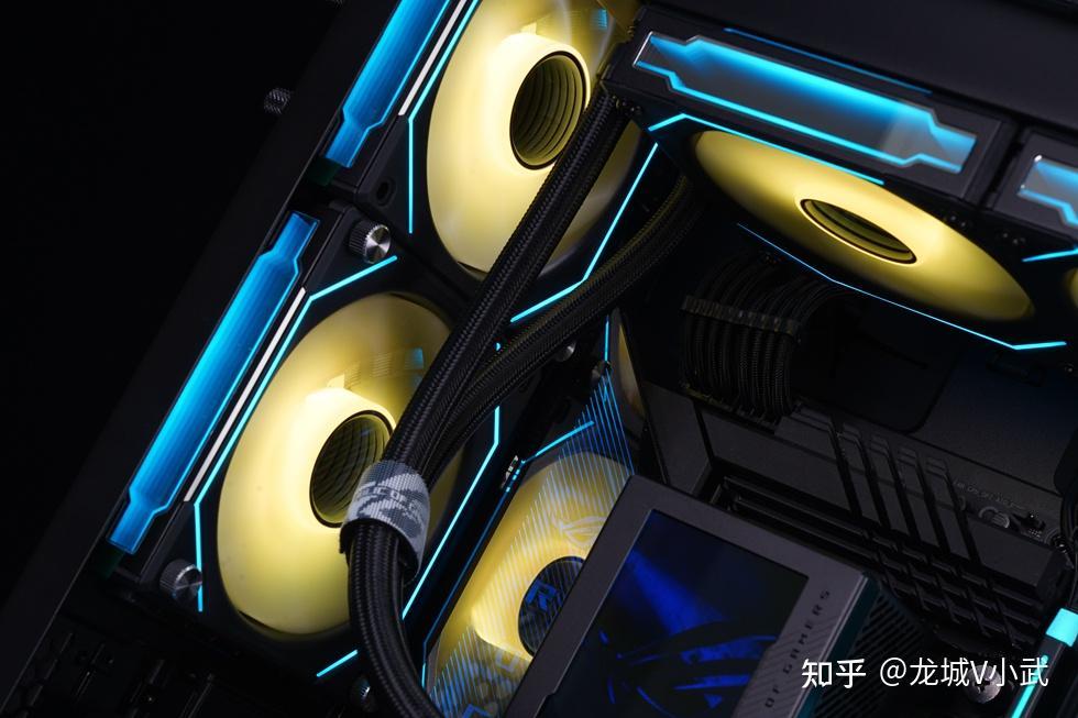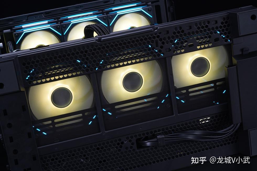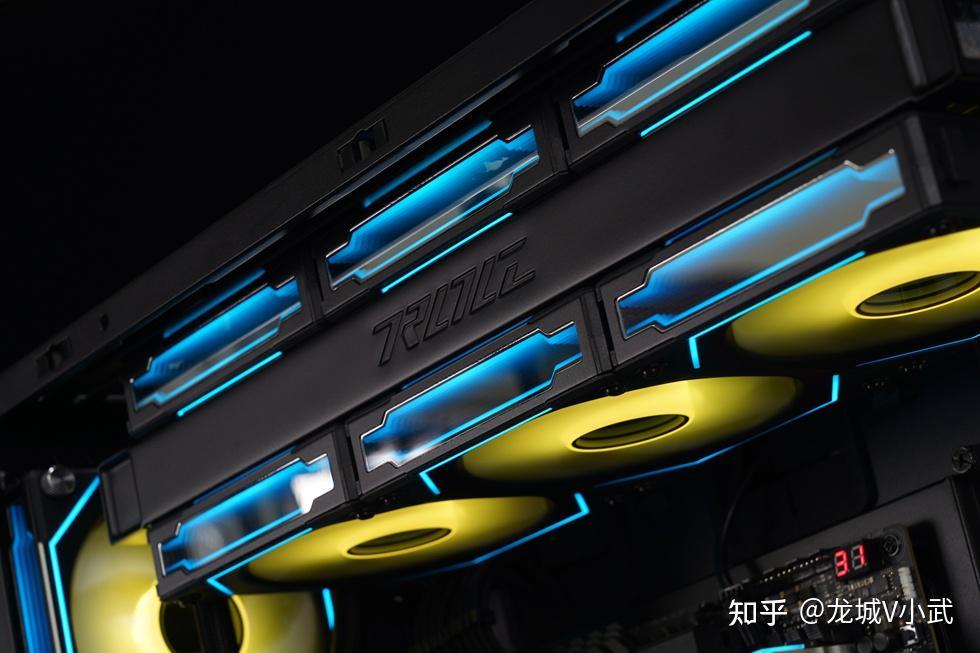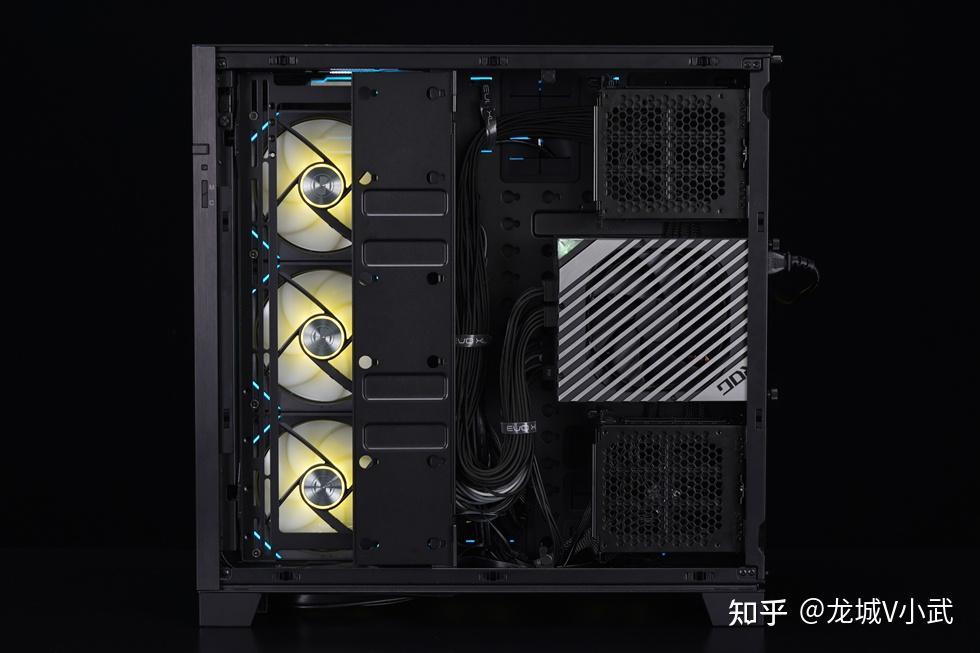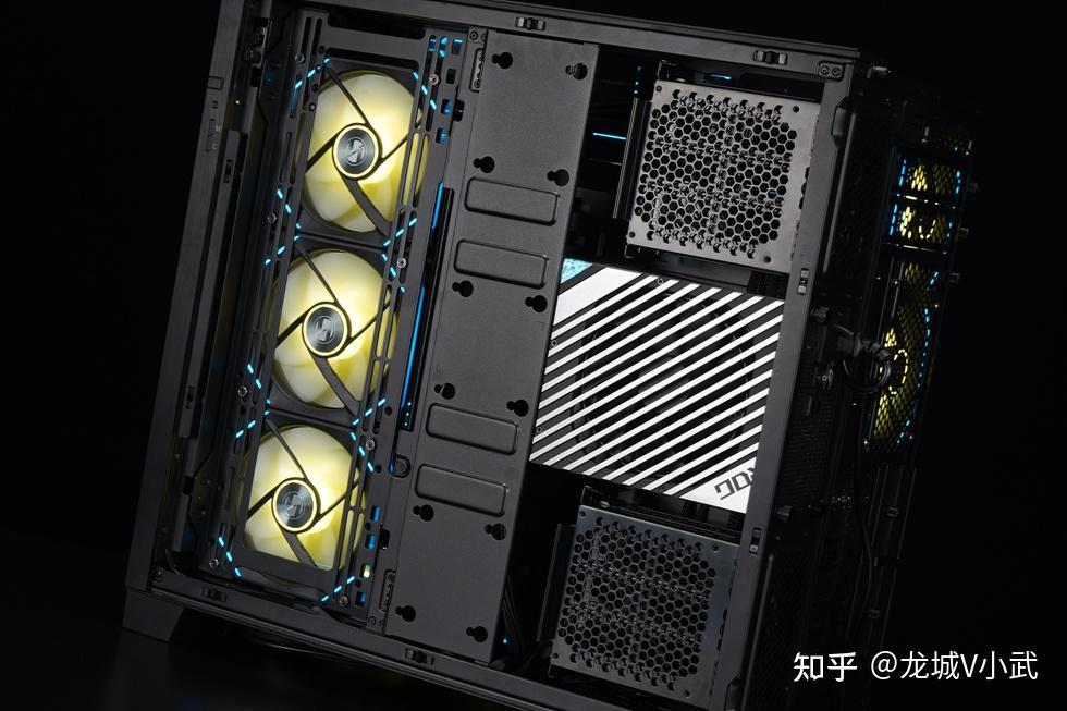 此次裝機我選擇的是機箱常規的右側擺放,主板托架下沉到最低擋位,尾部安裝兩枚120MM風扇,頂部採用夾漢堡方式安裝360一體水冷排,整機一共安裝了14枚機箱風扇,最大程度加強整機的散熱能力。