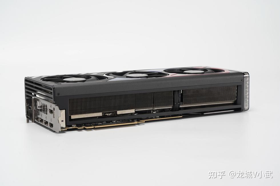 顯卡背面採用全金屬背板,背板尾部採用鏤空格柵設計,能有效帶走熱氣流,減少機箱的熱堆積,從開窗處可以看到顯卡的散熱模組,採用大面積的散熱鰭片加7熱管的組合。