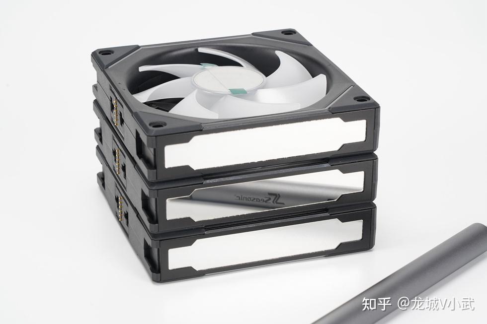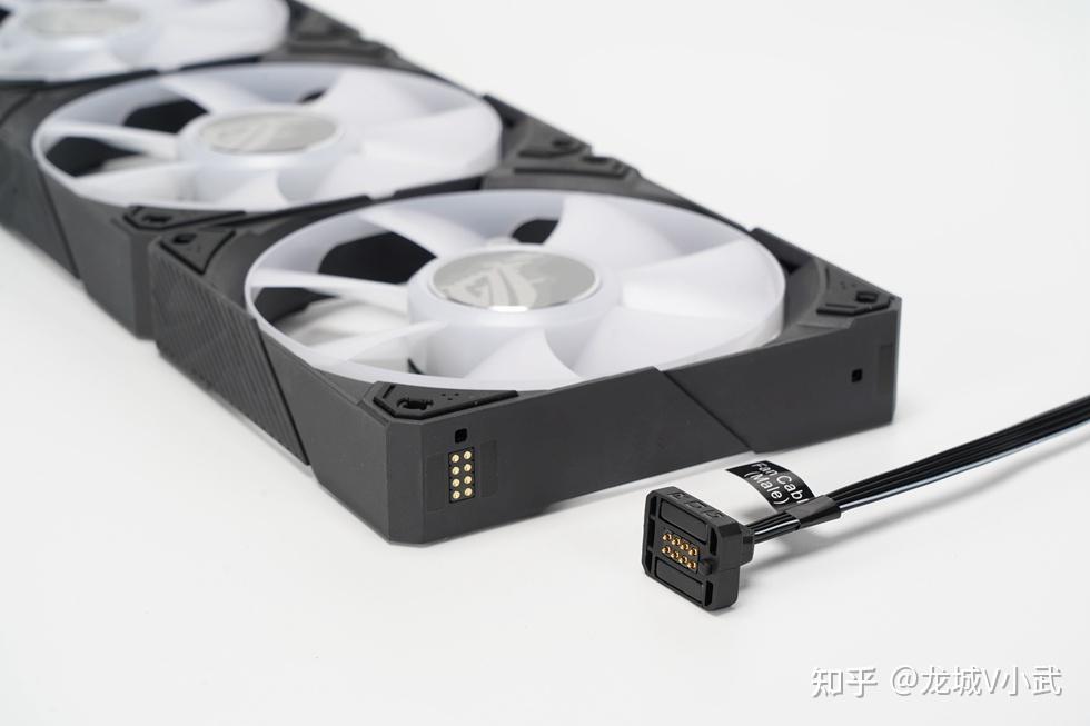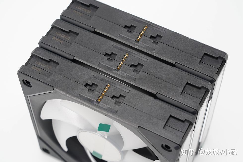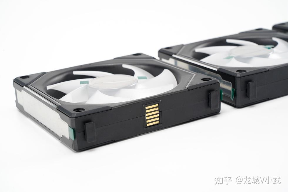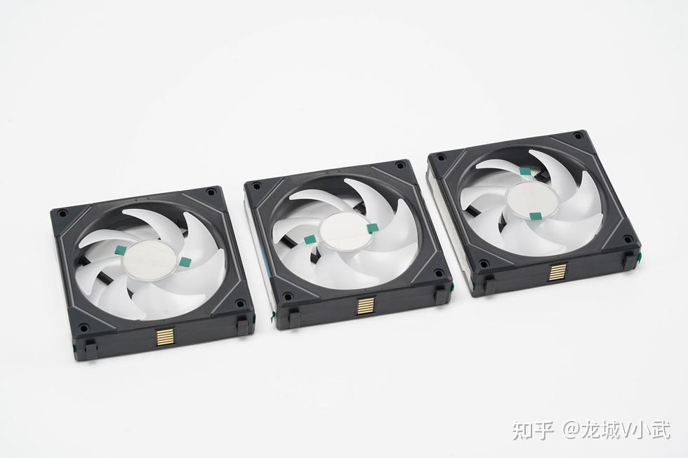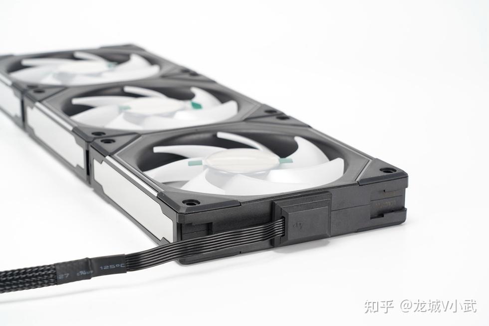 風扇最大的特點是採用磁吸式鏈接設計,另外風扇的鏈接線同樣爲磁吸安裝,三顆風扇相連只需要一根線材即可實現智能溫控以及RGB燈效,非常的方便。
