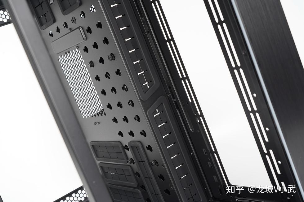 多元化的機箱尾部可玩性實在太強了,左右分倉設計,左倉上下爲硬盤籠電源位中置,側板固定均採用免工具設計,右側上方的風扇位置默認可安裝一枚120MM風扇,內部主板托架可上下調節,下調到最低檔的話上面還可以增加一枚120MM風扇,配備了8條水平的PCI擴展槽。