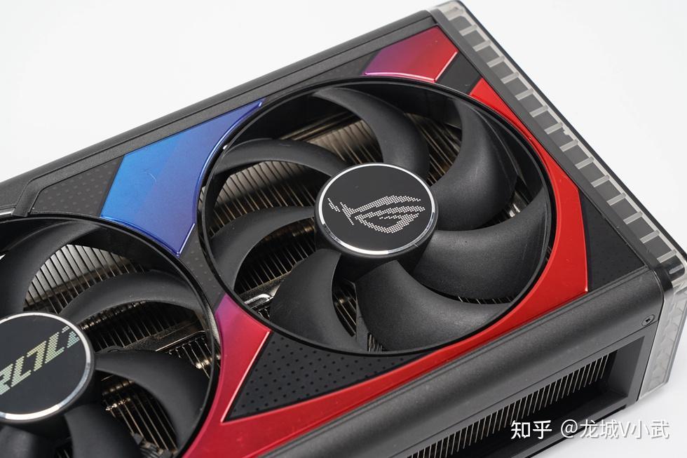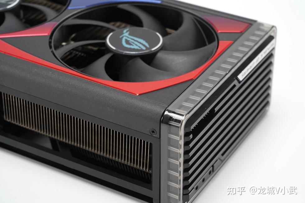 採用3個10cm雙滾珠軸流風扇設計,風扇中心印有ROG和敗家之眼的品牌LOGO,支持智能啓停,在未觸發溫度策略時比較安靜,空閒時可以減少顯卡的噪音和功耗,另外中央的風扇使用了反轉設計,讓散熱效率更加高效。