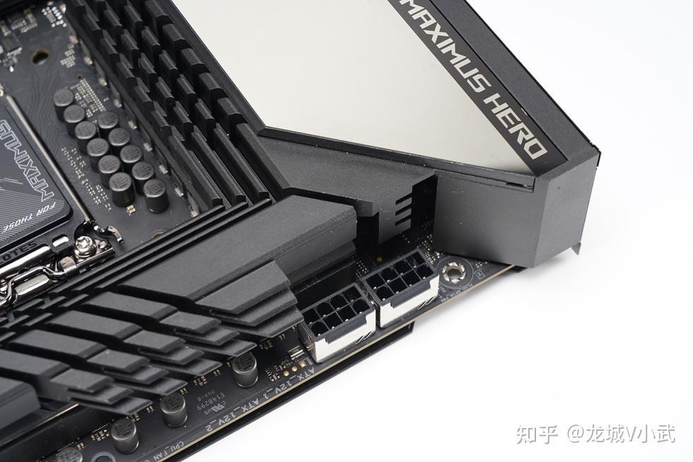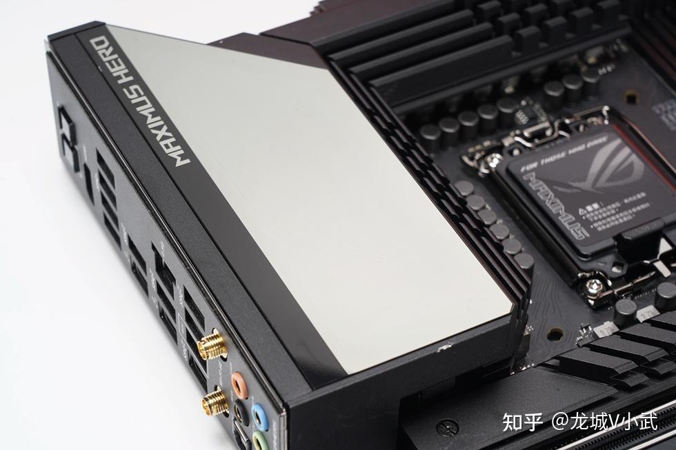 供電 I/O 散熱裝甲單面鏡+LED 點陣設計,加入 Polymo 動態燈效,可同時呈現 2 種圖案,可呈現 ROG/HERO 兩種圖案,並支持動態效果,可變幻絢麗多彩的個性圖案。左上角還有銀色 MAXIMUS HERO 字樣。