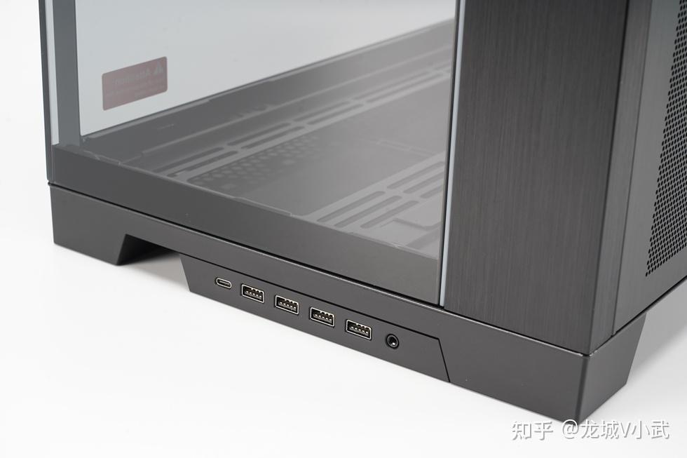 機箱IO 接口設計在了機箱的底部,是一個單獨的整體模塊,根據使用場景以及機箱擺放位置的不同,這個IO 模塊可以實現三個維度的安裝,接口提供了1個USB 3.1 Type-C、4個 USB 3.0 Type-A以及1個音頻接口。