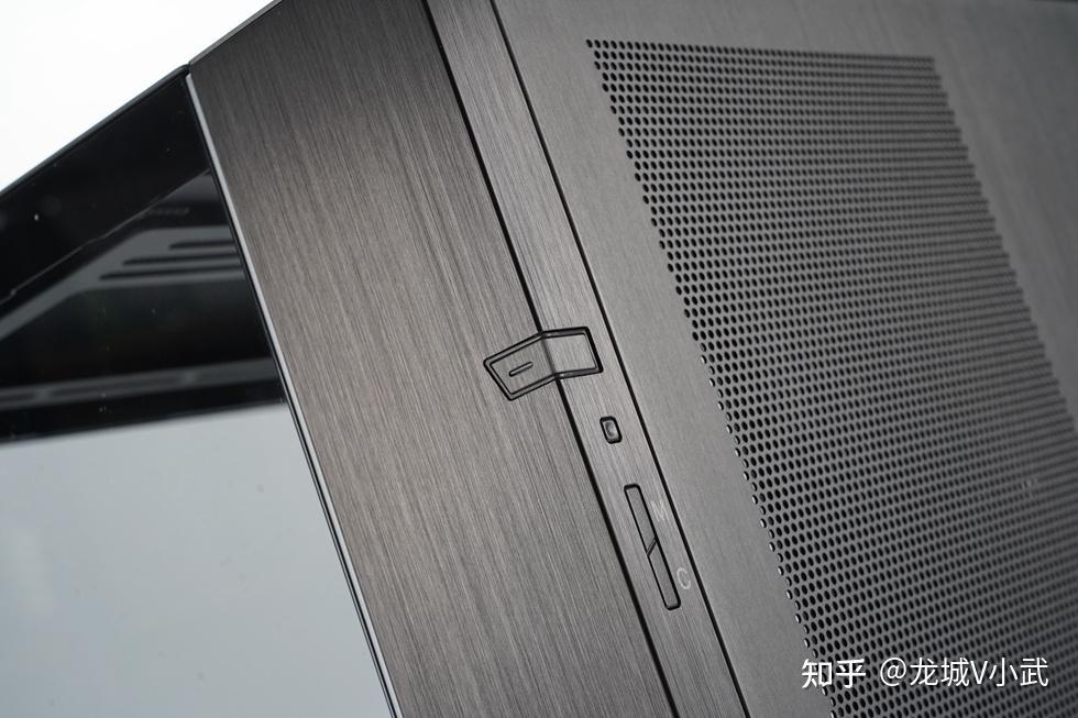 機箱的前面板和左側面板採用4mm厚度的鋼化玻璃,兩塊玻璃交匯處取消了立柱,一體化效果更加通透美觀。機箱前面板還內置有一條細長的RGB燈帶,燈帶的側部面板、頂部面板以及機箱背板均採用鋁合金材質,表面經過拉絲處理質感十足。