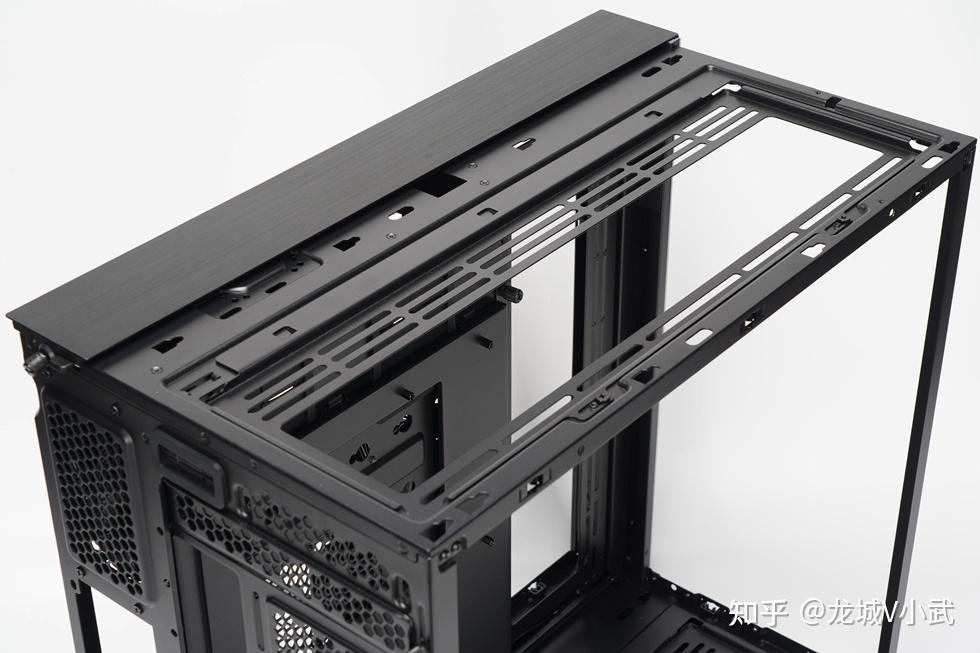 機箱頂蓋採用免工具設計,擰開尾部兩顆手擰螺絲即可取下頂蓋。頂部風扇支架可拆卸安裝,可以支持3把140MM120MM風扇以及420MM/360MM冷排的安裝。