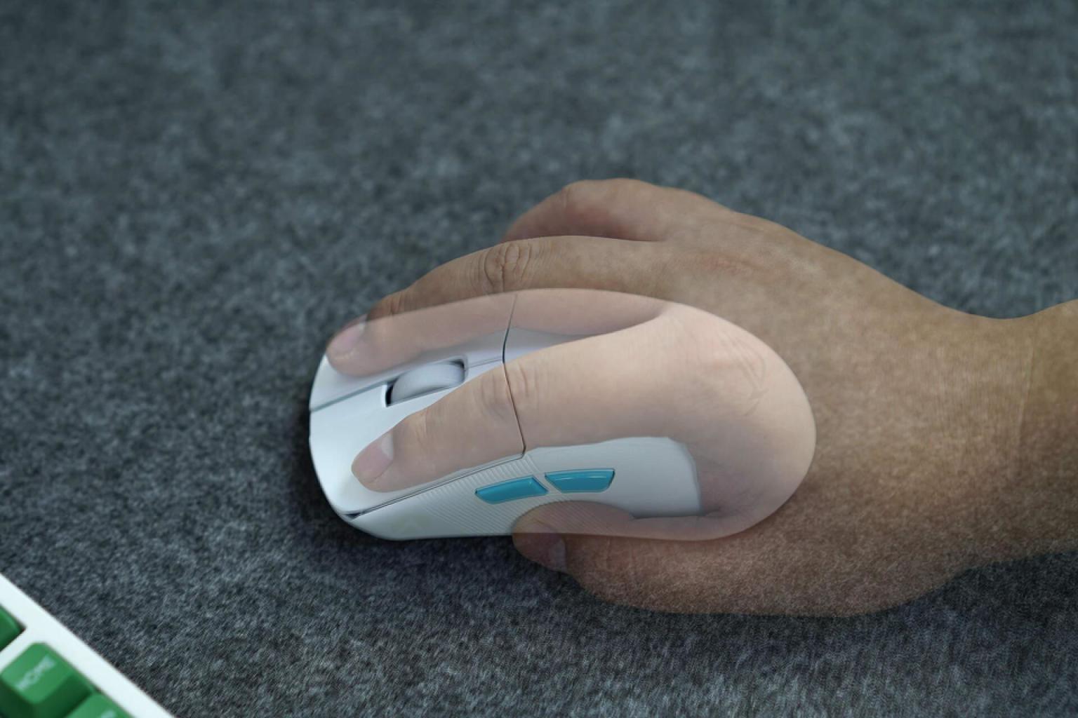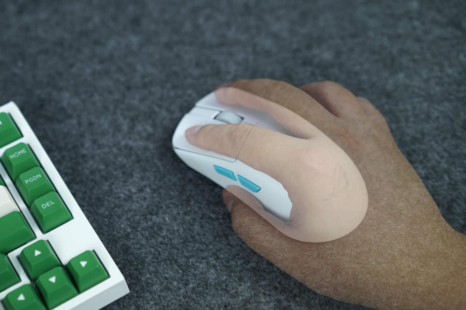 ROG龙鳞ACE是对称式设计,符合人体工学设计,左右手均可使用。鼠标尺寸约127.5*63.7*39.6mm,我的手掌长约20cm,刚好能以一种非常舒服的姿势握住这只鼠标。鼠标外壳采用生物基尼龙环保材质,表面磨砂质感,在保证玩家舒适的握感的同时也增强了鼠标的耐磨性、防滑性,大汗手再也不必担心汗水腐蚀心爱的鼠标啦。