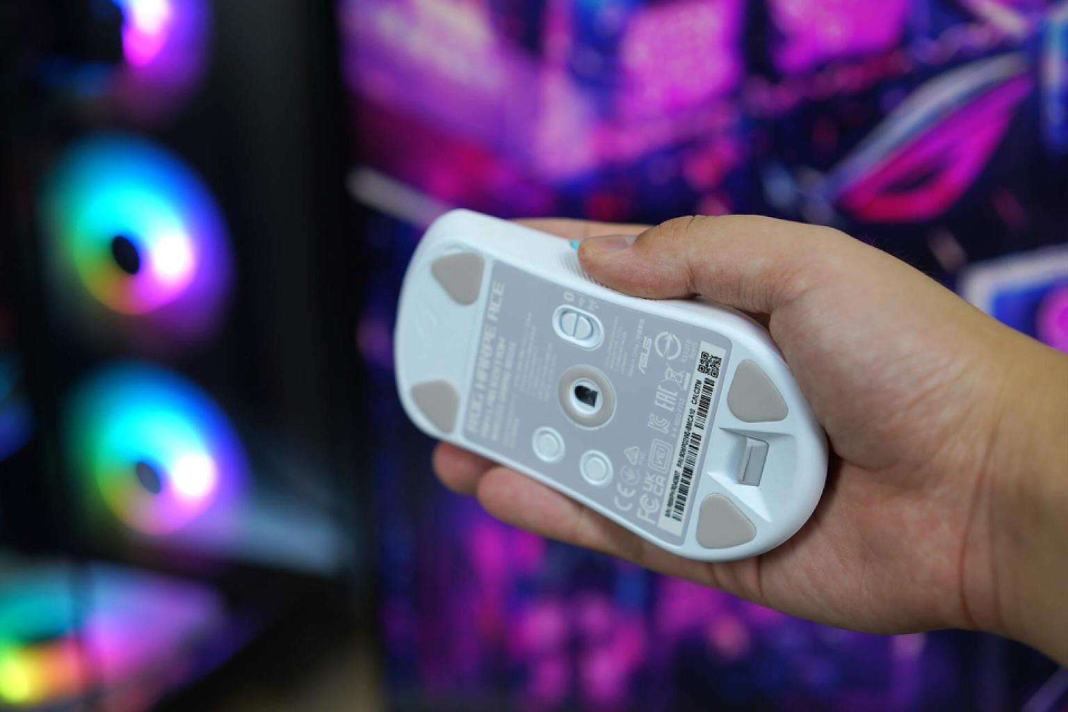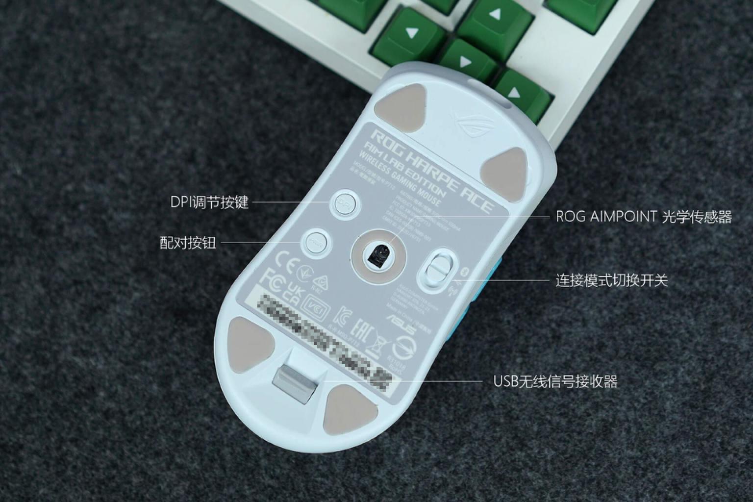 来到鼠标底部,集成了ROG AIMPOINT光学传感器、DPI调节按钮、配对按钮、连接模式切换开关、USB无线信号接收器以及四个角上的四块100%PTFE特氟龙脚贴