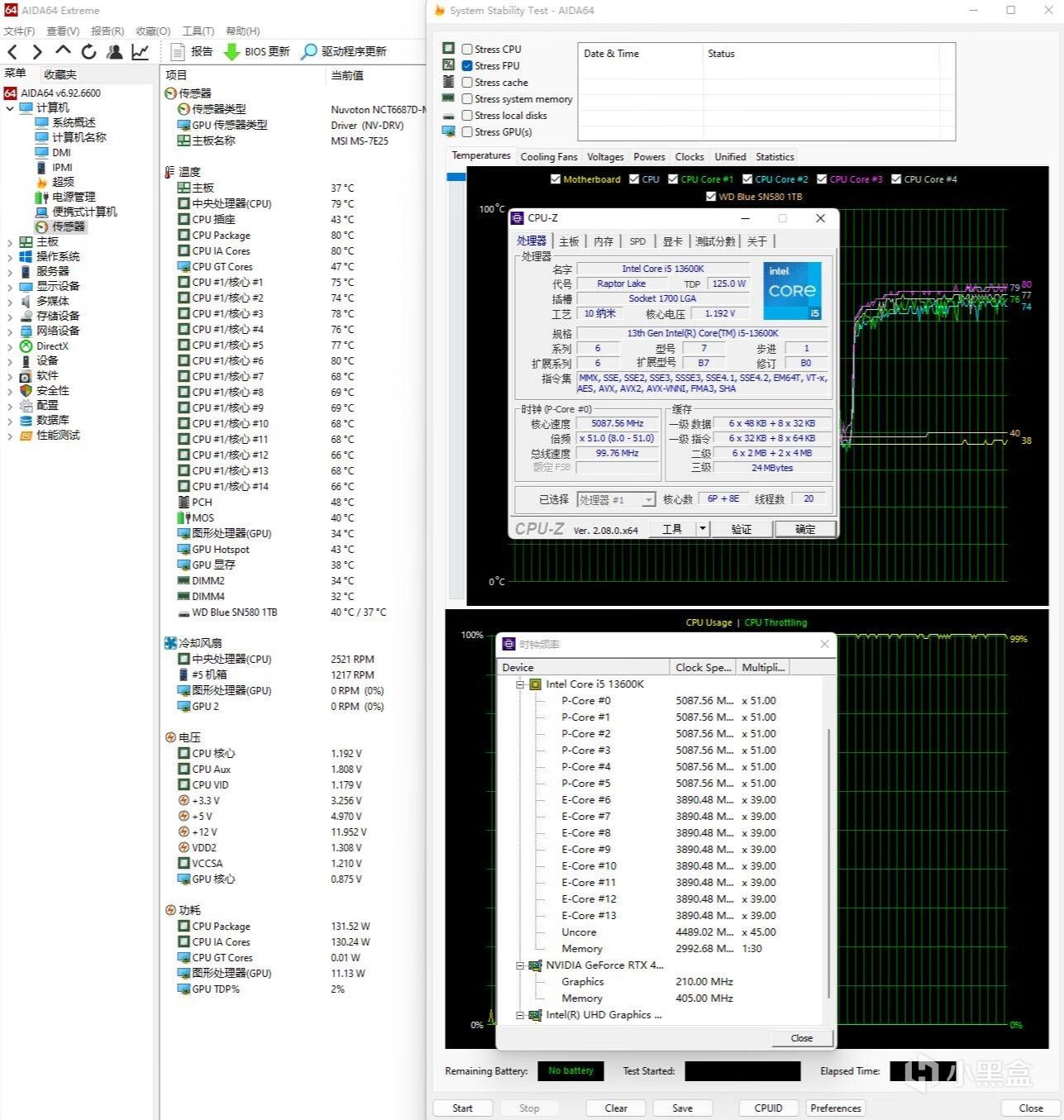 ▼简单跑个CPU-Z的压力测试,处理器功耗在135W左右,大核心睿频5.1GHz、小核心睿频3.9GHz,温度在79℃左右,南桥48℃,供电40℃,内存34℃、32℃,固态40℃、37℃。