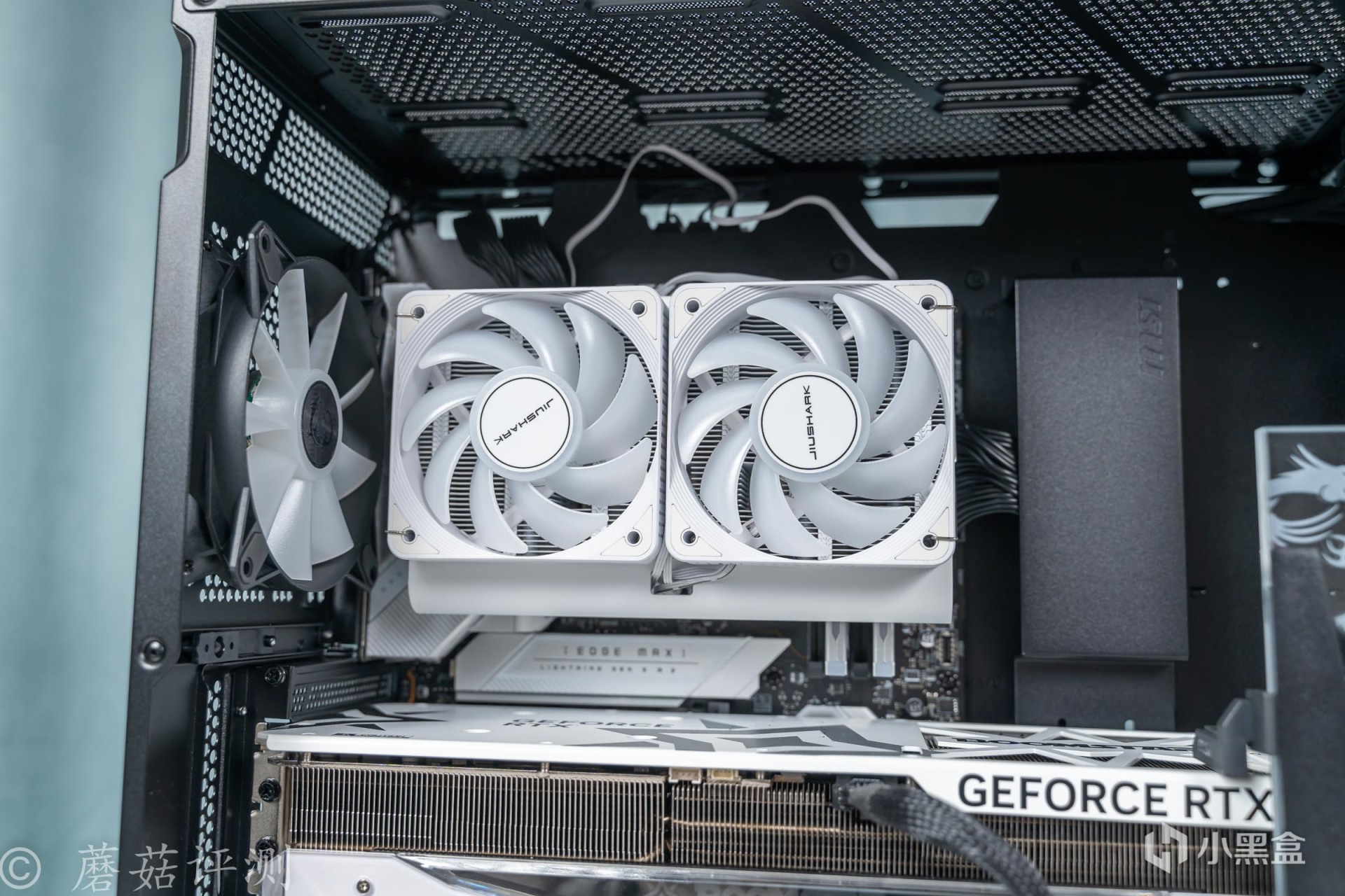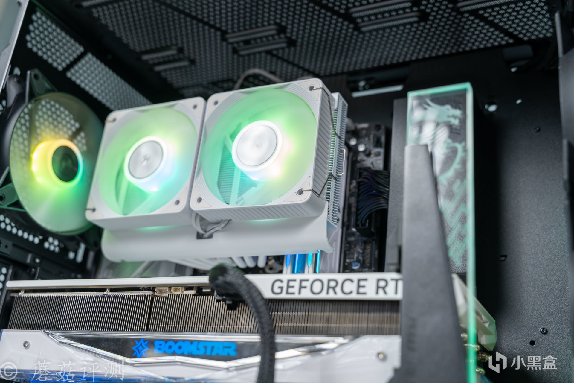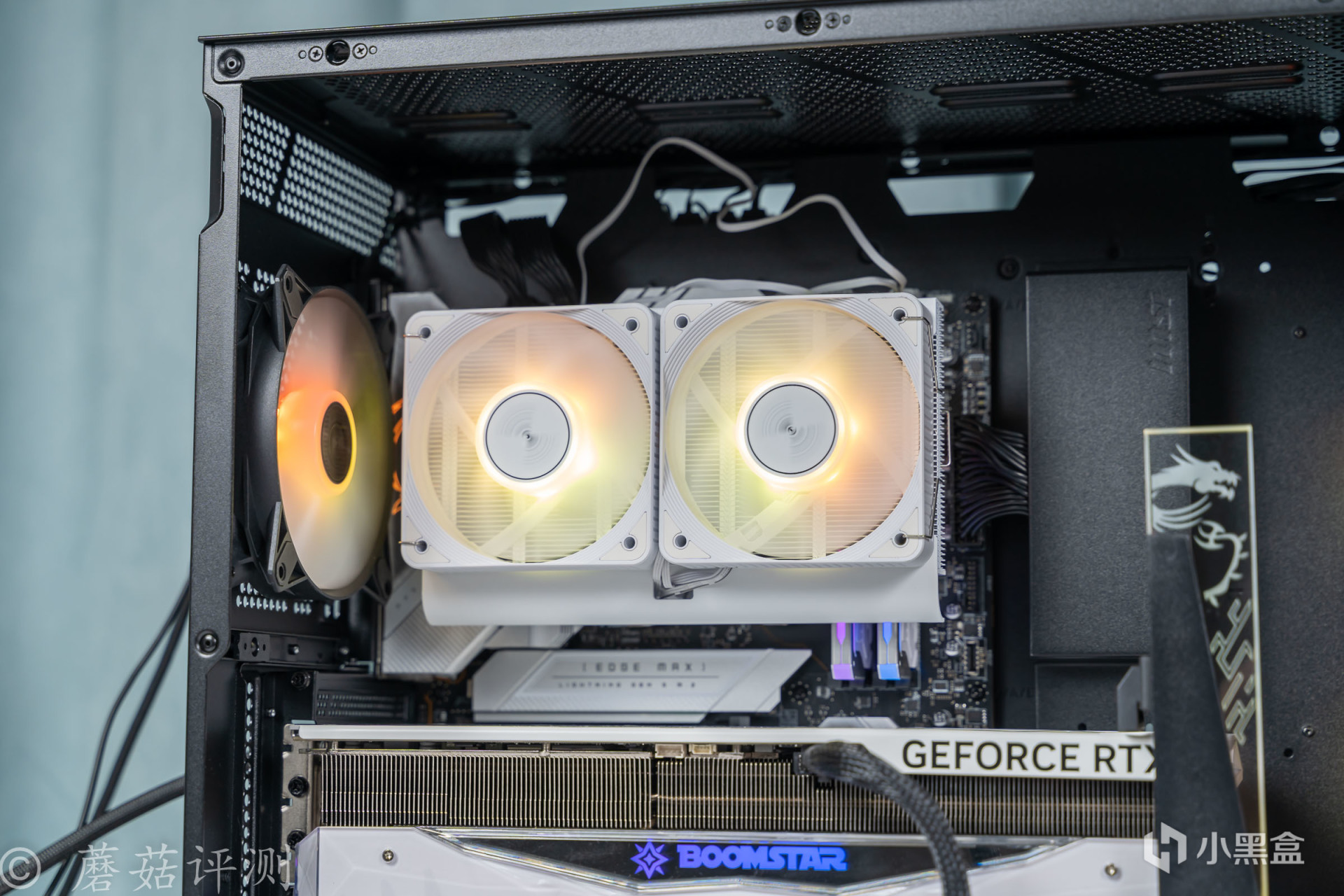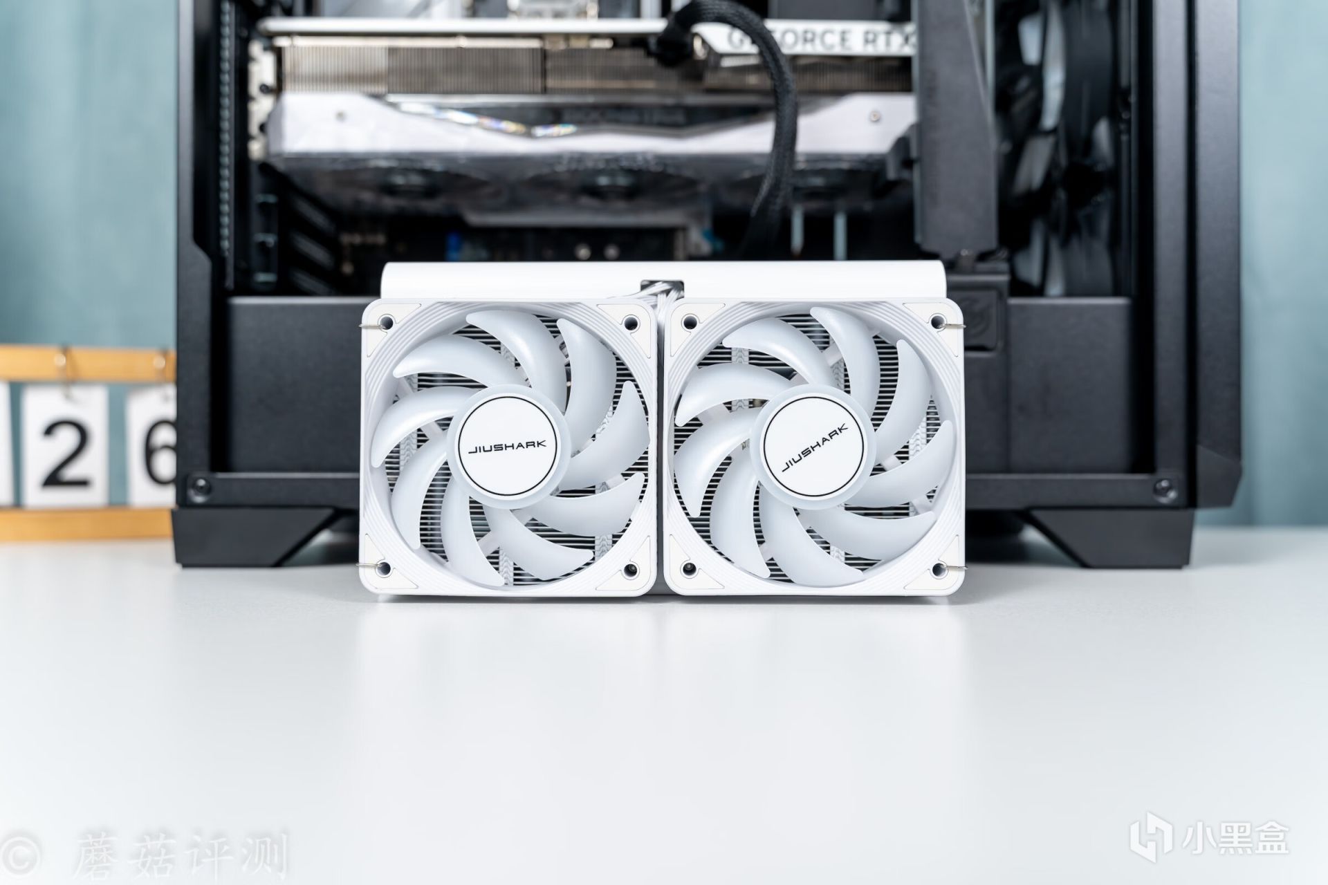 ▼散热器的两把散热风扇颜值很漂亮,乳白色的扇叶柔光效果很不错,颜色过渡很均匀。