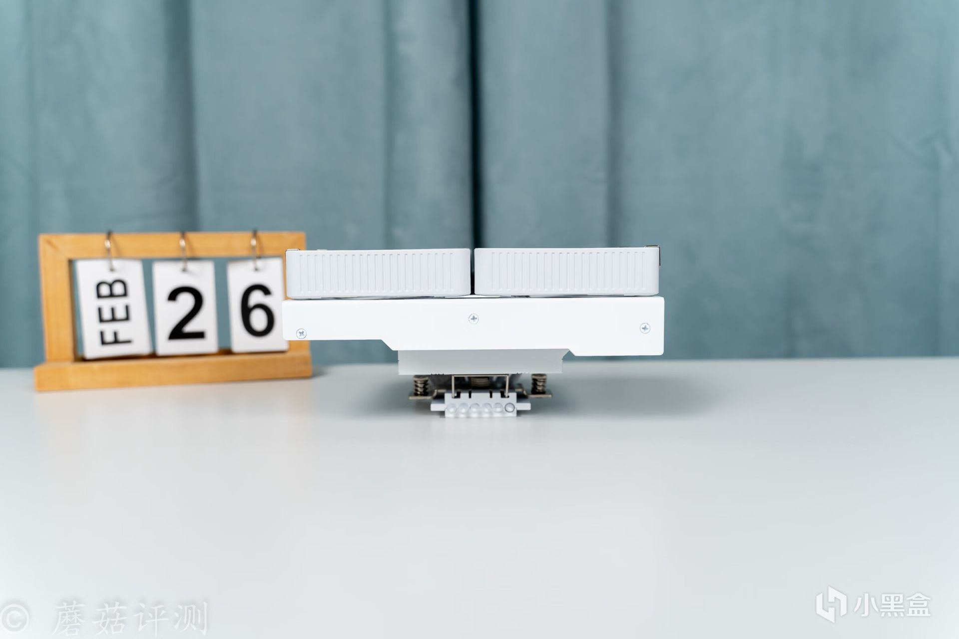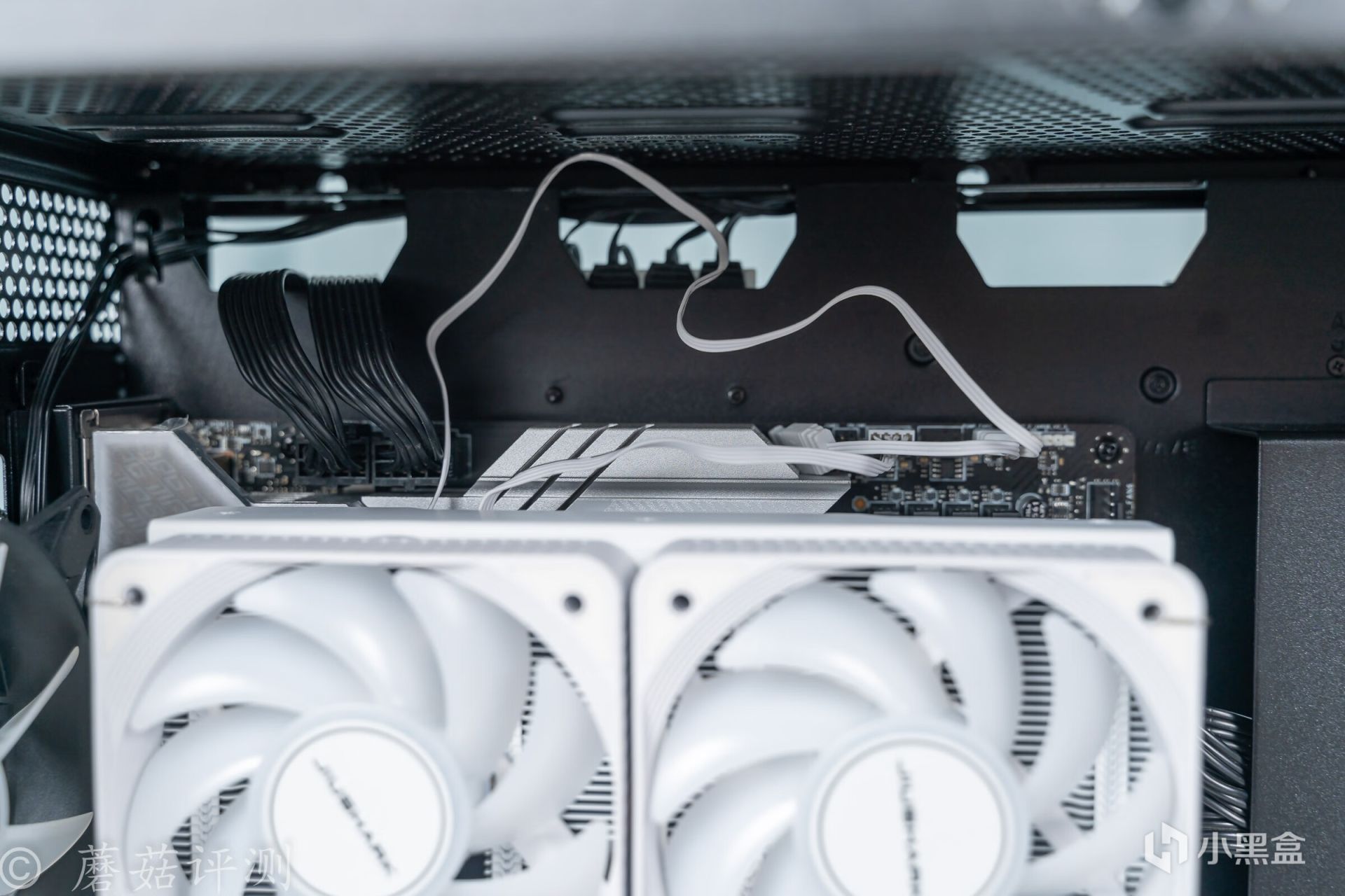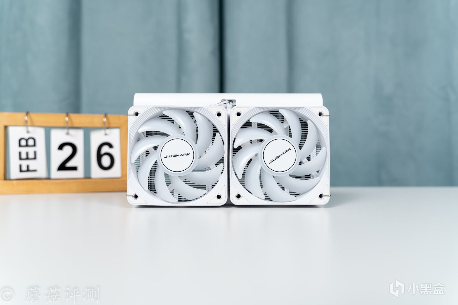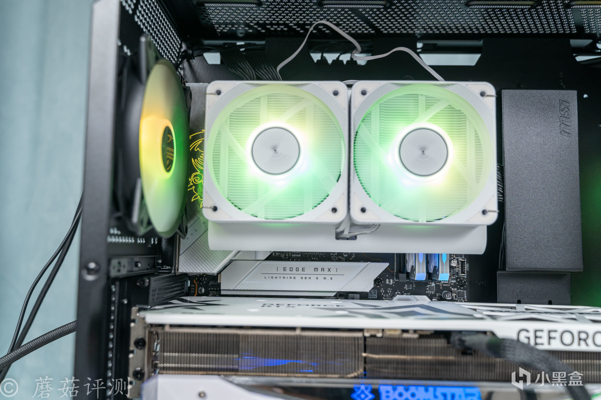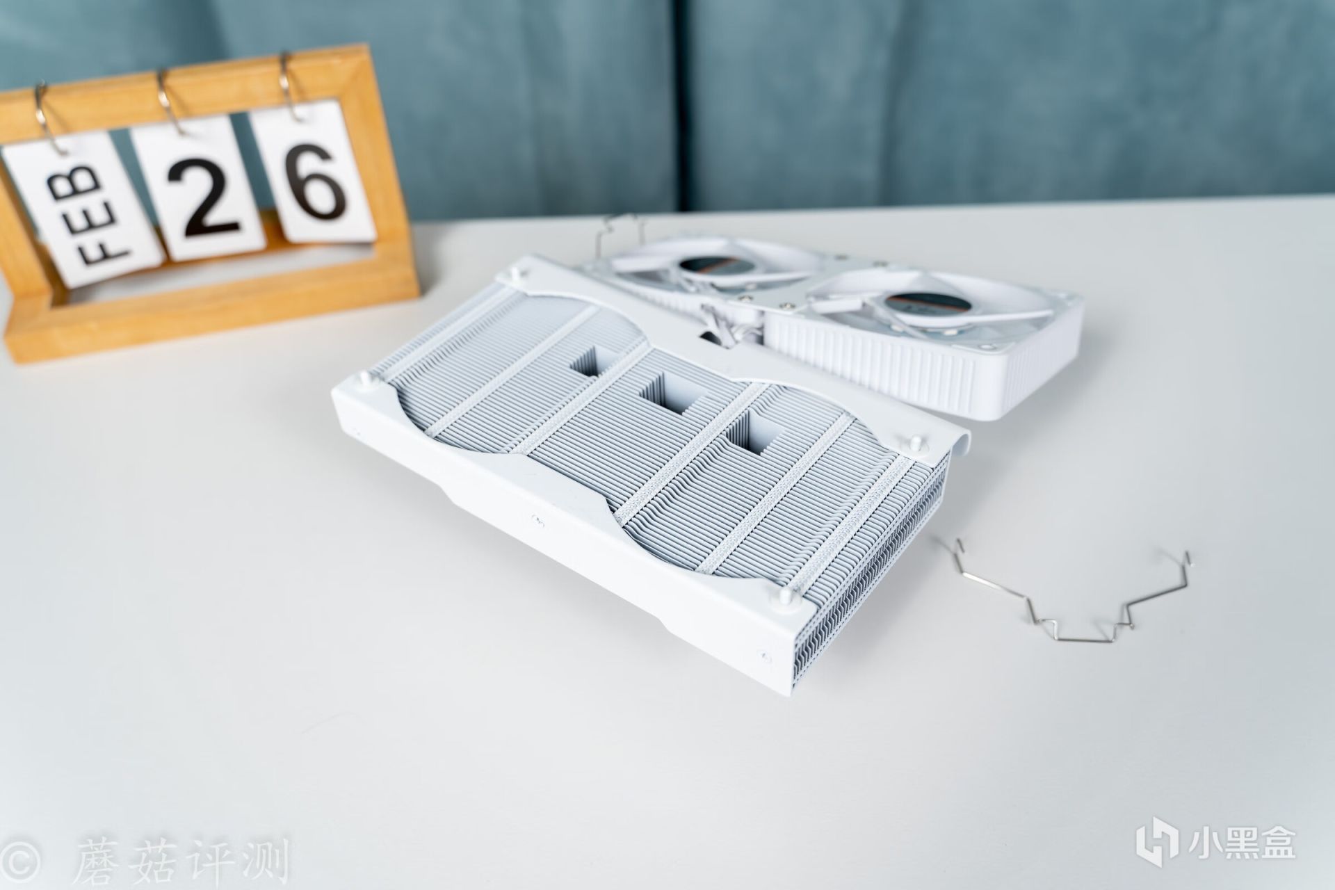 ▼散热器的两把散热风扇颜值很漂亮,乳白色的扇叶柔光效果很不错,颜色过渡很均匀。