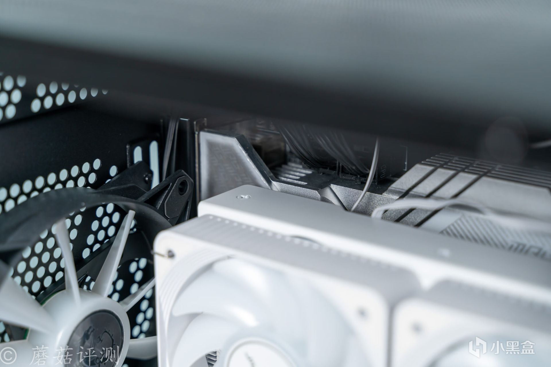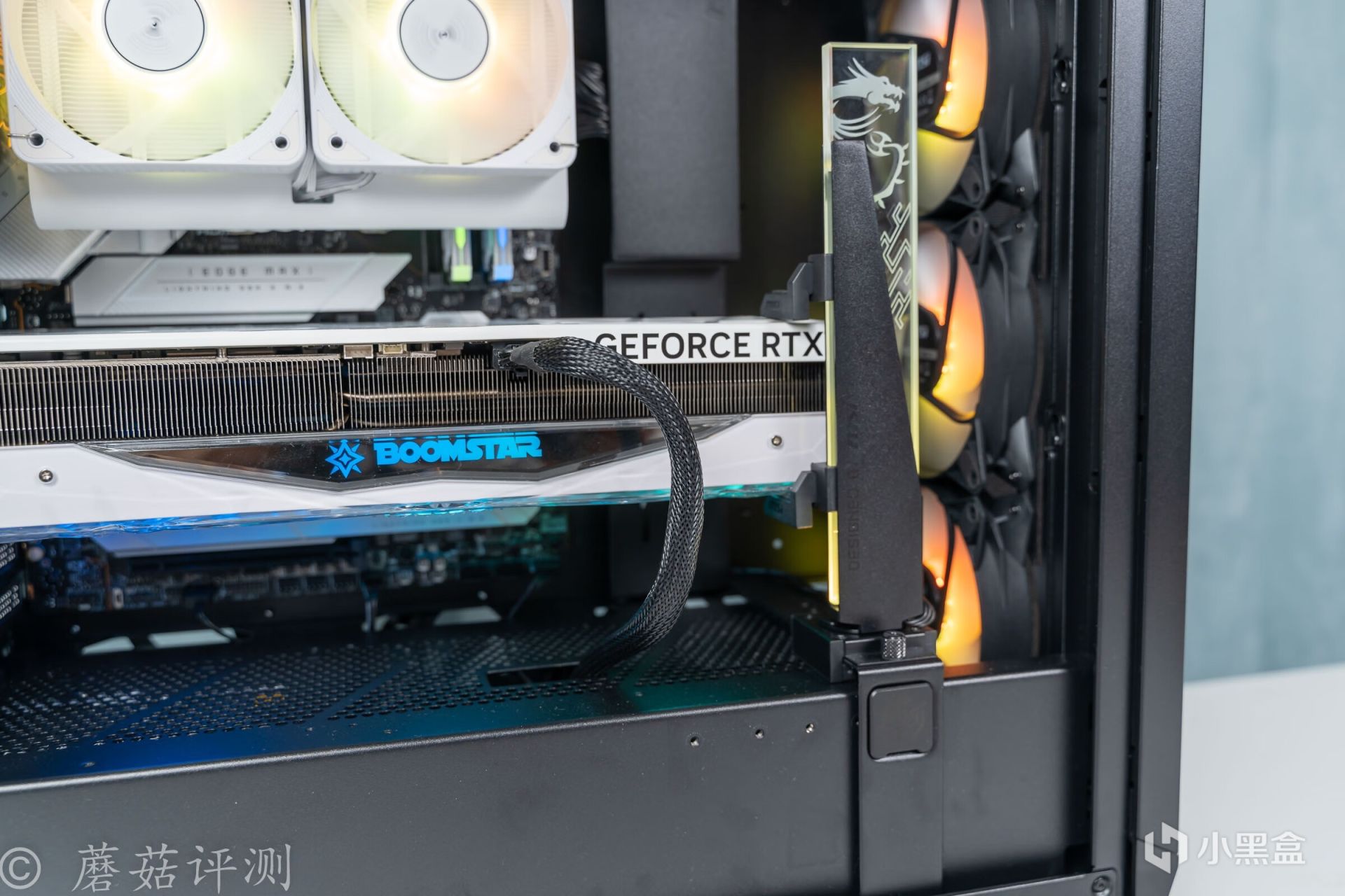 ▼机箱的内部空间表现也非常不错,可以轻松的装下影驰这张RTX4090星耀OC显卡,另外在显卡的尾部,还有一个机箱标配的显卡支架,玻璃材质的,支持ARGB灯效,颜值和功能性直接拉满。