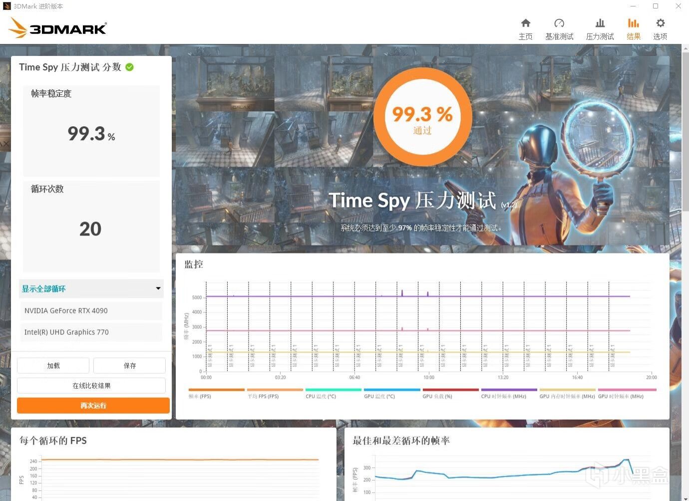 ▼跑个3Dmark的压力测试,TS模式,帧数稳定率在99.3%,非常稳定。