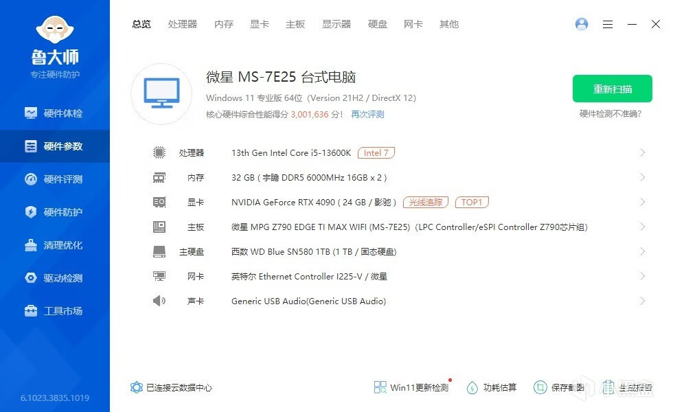 ▼整机配置一览,处理器是13600K,主板是微星的Z790刀锋Ti MAX,显卡是影驰的RTX4090星耀OC。