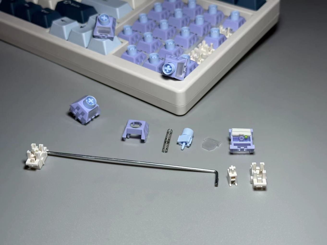 s99有2种轴体可以选择,我手上的是VGN找凯华定制的极光冰淇淋轴体,轴体外观紫壳加蓝色圆轴芯,轴体材质为全POM材质,出厂带有润滑处理。整个轴体的为1.4mm触发到3.5mm的触底,属于一个打游戏办公都能胜任的轴体。